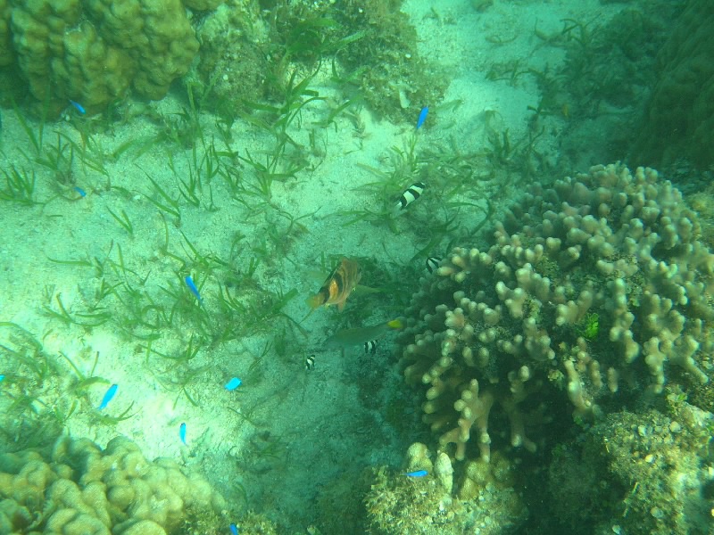 少し夕方になってきたかな。でもまだ肝心の、海に行っていない。ここから近いところにあるのが新城海岸、宮古島ではかなり有名なビーチの一つだ。到着すると、何台か車が止まっているがそれほど人は多くないようだ。さあ、早速泳ぎましょう。シュノーケリングの準備をして、水中カメラをもって波打ち際に。海に入ると、すぐにいろんな種類の熱帯魚がいるのが見えた。いいぞ。でも写真をとるには、ちょっと透明度が今ひとつかなあ。あと少し日が傾いているので、もう少し明るいともっときれいに撮れたかな。でも海を楽しむにはこのくらいでも十分、何度も潜りながら、いろんな魚を探す。少し離れたところにエイもいたが、写真はうまく撮れなかった・・・