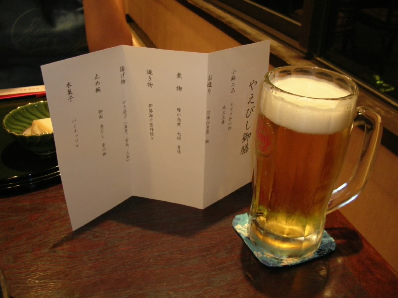 ホテルに戻り、とにかくまずはシャワーを浴びてさっぱりだ。そろそろ晩ごはん、今日はどうしようかな。ちょっと疲れたし、今日はホテルでいただきましょうか。というわけで、ホテルの中にある「やえびし」へと向かう。まずはオリオンビールで乾杯。今日一日の疲れが流されていくね。さて、このあとは「やえびし御膳」。沖縄づくしという感じでないが、もずくやジーマミ豆腐、角煮などもあるし、かき揚げにはゴーヤも入っているしでなかなかの美味。メインは伊勢海老の雲丹焼き、たまにはのんびりこういうゴハンもいいですね。ビールをおかわりしてお腹いっぱいです。