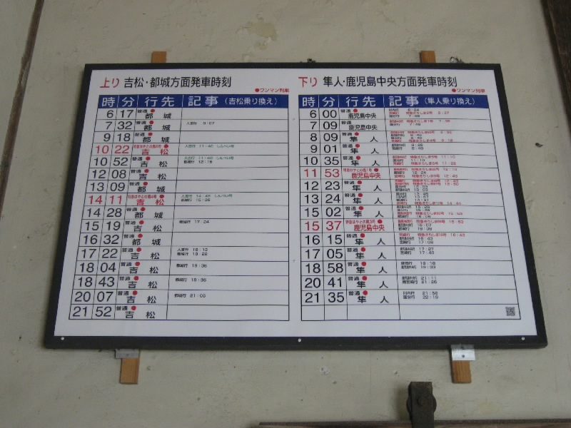 しばらくすると、遠くで線路を打つ音が聞こえてきた。その音は次第に大きくなり、黒い車体が見えてきた。11時53分「特急はやとの風1号」が嘉例川駅に到着。数分の停車時間があり、その間に電車に乗っていた人も降りて駅で写真をとっている。あれほど静かだった駅が、束の間の賑やかさに包まれる。誰もいない駅舎を早めに撮れてよかったな。特急の車内は木目が主体の暖かいデザイン。新しくてきれいだね。さて、電車も出発したし、お楽しみの駅弁タイムとするか。この「かれい川」は地元の野菜を中心にしたボリュームたっぷりの駅弁だ。「がね」もおいしいし、シイタケやタケノコごはんも美味。タケノコ入りのコロッケもいいねえ。優しい手作りの味わいに満腹、幸せです。小一時間ほど走り、電車は山から海へと出た。ちょっと霞んでいるが、海の向こうに桜島が見えている。ここまでくればもう少し。そして12時51分、鹿児島中央駅に到着した。かつての西鹿児島駅であり、昔がどんな様子だったかは知らないが、九州新幹線の開通に合わせてリニューアルされたのであろうきれいな駅だ。ちょっとこの駅でゆっくりしようかとも思っていたが、13時15分に山川行きの「なのはな号」がでるので乗ってしまいましょう。地元らしき人でそこそこ席は埋まっているが、ちょうど2人がけが開いていたのでラッキーだ。ここから指宿までは一時間ちょっと。鹿児島中央駅を出ると、再び桜島を見ながら錦江湾沿いをゆったりと走る。しばらくは景色を見ていたが、海から離れたあとはほとんど眠りに落ちていた。途中でも海沿いを走っていたような気はしたが・・・14時半ごろ、指宿駅に到着。