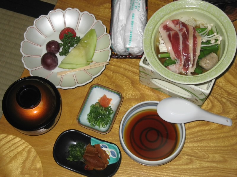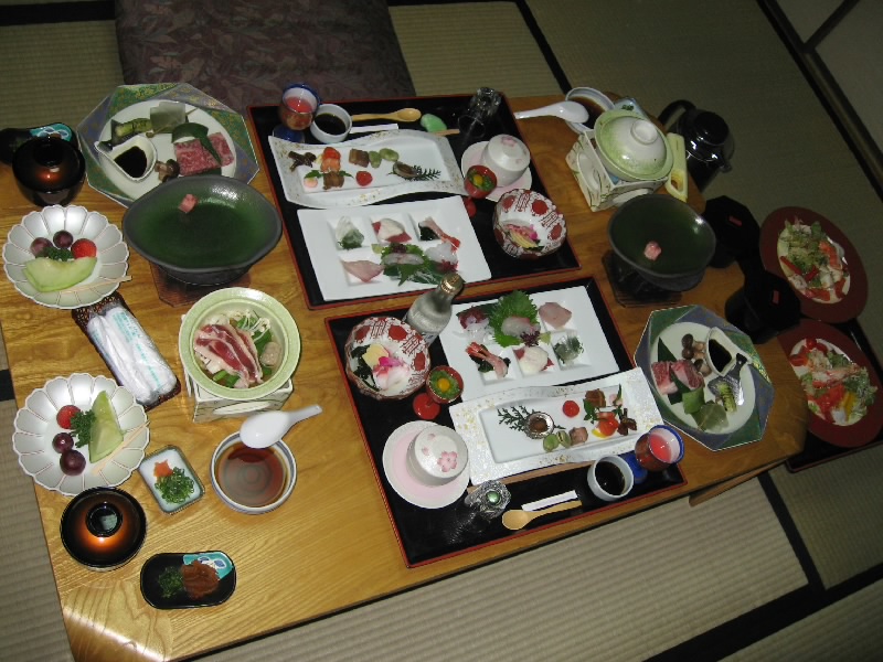その後は部屋でテレビをみながらのんびり過ごす。そして7時になり、お楽しみの夕食タイム。今回は部屋食だし、ゆっくりお酒を飲みながら楽しみましょう。刺身などの前菜系は種類が豊富でいい感じ。味多膳というこのプランのメインは、黒毛和牛をおろしたてのワサビで食べるもの。少し厚めの和牛の表面を軽く焼き、ワサビを添えていただく。うん、広がる肉汁とワサビの香りがいいね。付け合せのアロエが初めての食感でなかなかおもしろい。このあたりではポピュラーな食べ方のようだ。お酒を追加して、当然のごとく完食。全体的な感想として、ボリュームはちょうどいい。味もいい。ただ一つ、サラダのカニはいかにも冷凍ものという感じで、パサパサしていてこれだけはNG。なにも鹿児島の温泉宿で無理にカニを出さなくてもいいと思うのだが・・・