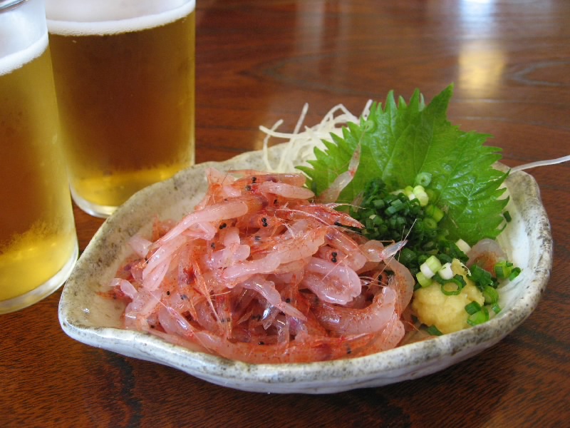 焼津駅で降り、タクシーで「焼津さかなセンター」へ。焼津港で水揚げされた魚が所狭しと並んでいる。新鮮な魚はつやがあって、目がキラキラ光ってとてもきれいだね。ある魚屋さんで教えてもらった食堂が「まるまん」。ここで新鮮な魚がいろいろと食べることができる。春なので、旬の「桜えび」をいただく。駿河湾でしか取れない桜えびを生でいただくのは最高の贅沢だね。ほのかな海の香りが冷えたビールとよく合います。あと中トロ丼に、キンメダイの煮つけをいただく。市場だけあって安くておいしいねえ。大満足です。 |