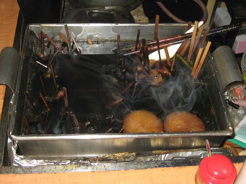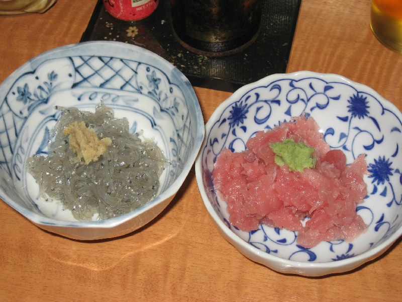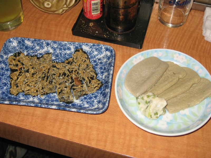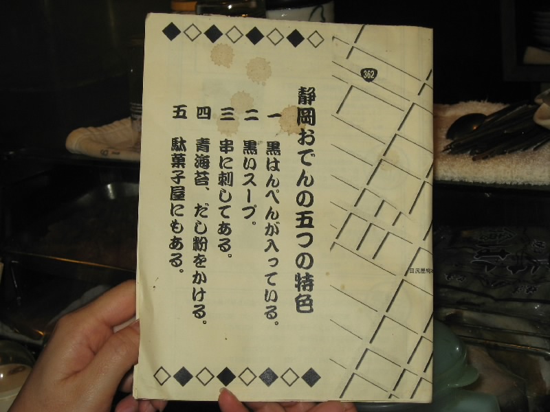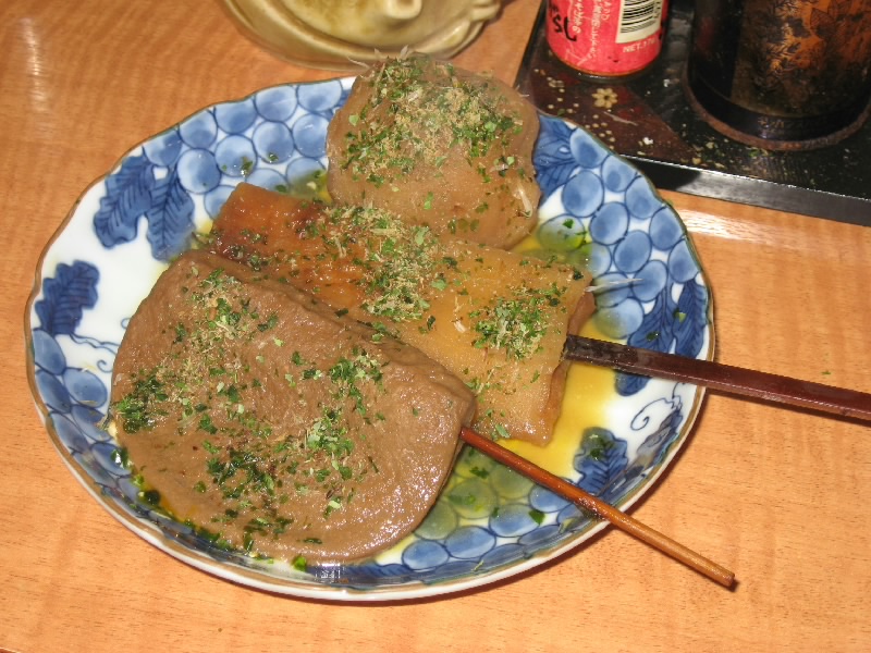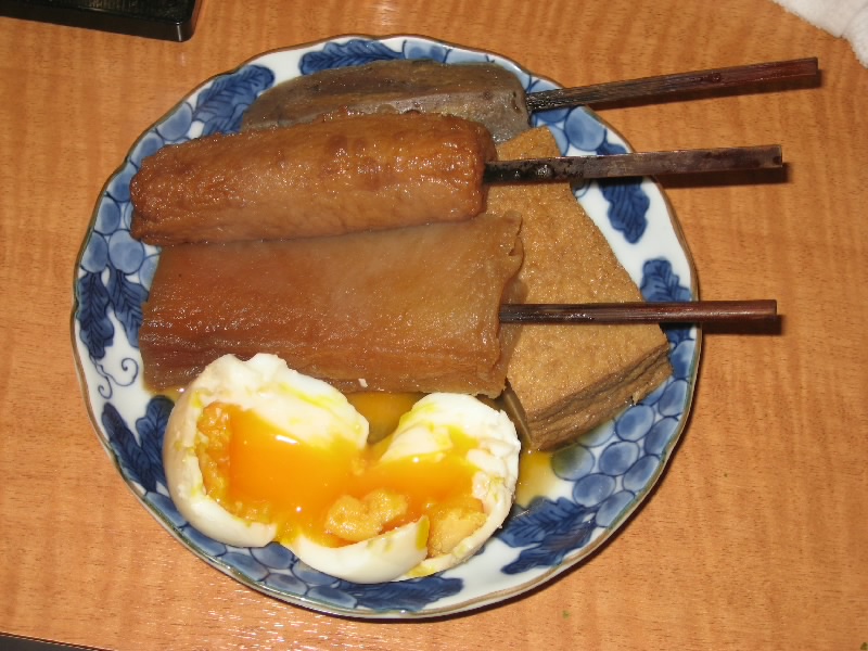 静岡駅に着き、ホテルにチェックイン。少し休憩して、いよいよ「青葉おでん街」へ。キリン一番しぼりのCMで見てから、気になっていたところだ。狭い路地に20軒ほどの店が並んでいて、どこも結構賑わっているようだ。コマーシャルにも出ていた「三河屋」は満席で入れない。さあて、どこに行こうかな。ぶらぶらとのぞいていると、「生シラスあります」との魅力的な文字が。ということで「よしく」へと入る。狭いお店にすでに4人お客がいて、あとで2人がすぐにきて、これで8人満席。突き出しは生シラスと中オチ。新鮮でおいしいね。静岡おでんといえば黒はんぺん、これに青ノリとイワシ粉を振りかけて食べる。青魚の風味がいいね。半熟の卵もおいしいし、白焼きという、ちょっともちっとした歯応えの練り物もおいしい。うーん、いいねえ。のんびりして来たところで、近くの酒屋で地酒をゲットして肴タイム。タタミイワシに生の黒はんぺんとワサビ漬け、そして自家製のホタルイカ沖漬け。酒にあう、旨すぎる。しめには桜えびと葱、豆腐を煮込んだ「あがり」といわれる鍋を楽しむ。あーうまい。お店のご主人もいい感じの人だし、地元の人らしきお客さんとも気さくに話せるし、随分と長居をしてしまいました。初体験の静岡おでんは、とても楽しい夜となった。 |