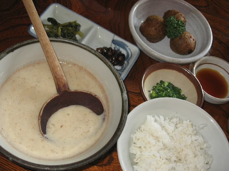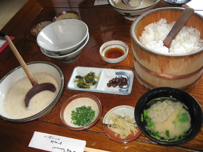 さて、とろろ汁をハシゴしますか。昨日よしくのご主人に教えてもらったお店にも行ってみたいからね。吐月峰方面に少し歩くと駿府匠宿という施設があり、お土産屋さんもある。その奥に何軒かとろろ汁のお店があり、その中の「鞠子茶屋」へと入る。さっきの「丁子屋」はいかにも観光客相手のお店だが、ここは地元の人がよく来るお店、といった感じ。当然、とろろ汁定食を頼む。とろろの味が濃くて、これはさらにおいしいぞ。ただごはんは麦率が少なく、ちょっと重たいかな。でもおいしいとろろが食べられて、大満足です。 |