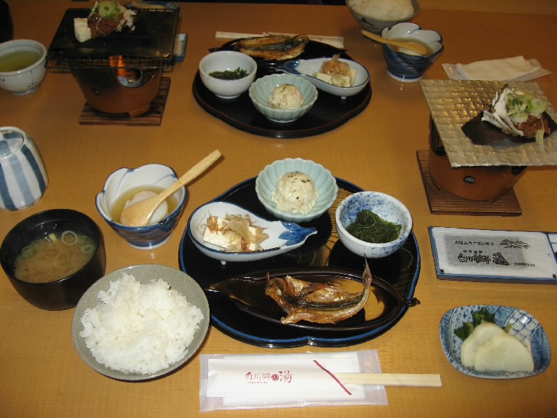 昨日と同じ席に、いろいろなおかずが並べられている。やっぱり飛騨らしく、朴葉みそ焼きがおいしそうだ。火をつけてしばらくすると、味噌がグツグツなり、舞茸やネギを混ぜていくと香ばしい香りが立ち上り、とてもおいしそうだ。これはごはんがどんどん進むなあ。2回おかわりをいただき、すべて完食。ごちそうさまでした。