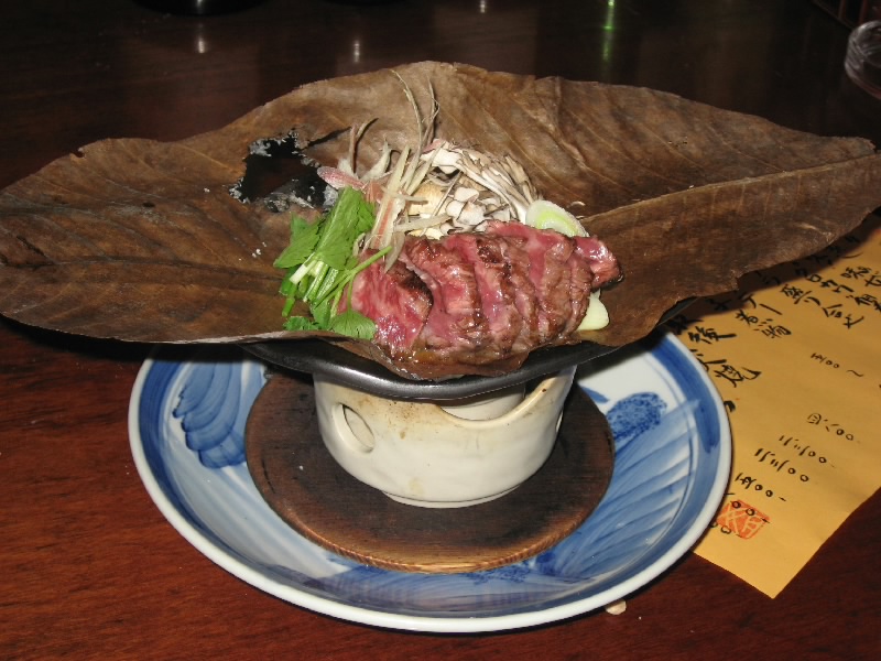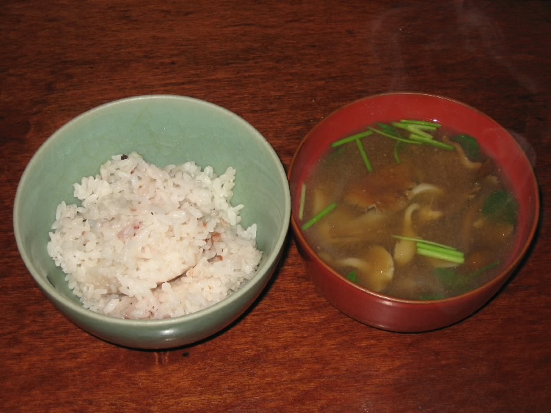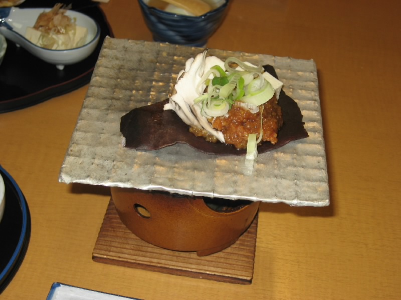 さて、そろそろ後半戦。やっぱり飛騨牛の朴葉焼きでしょう。お薦めの日本酒を聞いたらこれもオリジナルの「肴」ということで、それをいただきましょう。大きな朴葉にのった味噌と飛騨牛、ネギやミョウガや舞茸など、好きなものばかりではないか。しばらくすると味噌がふつふつとなってきたので、肉やネギと混ぜる。それをもう少し火を通すとできあがりだ。ネギ味噌をまとった熱々の飛騨牛、うまいねえ・・・3つめのオリジナル日本酒は大吟醸の3年古酒ということで、しっかりした味わいがよく合います。じっくり味わいながら、朴葉味噌焼きもお酒もなくなってしまいました。シメには飛騨のおいしいごはんと秋の味噌汁。この味噌汁、キノコがたっぷり入っていておいしいねえ。お漬物もいただき、大満足の晩ごはんとなりました。