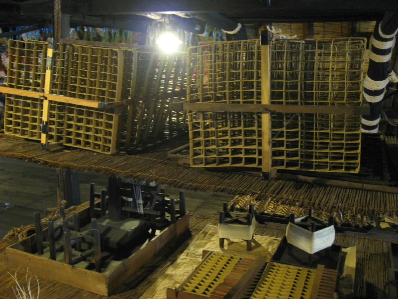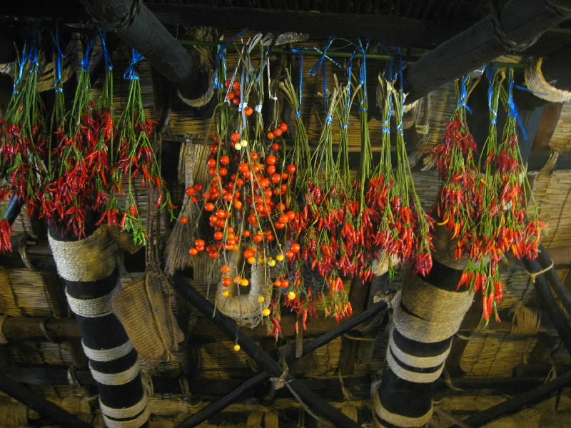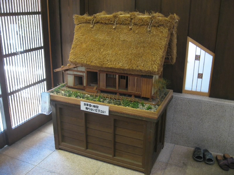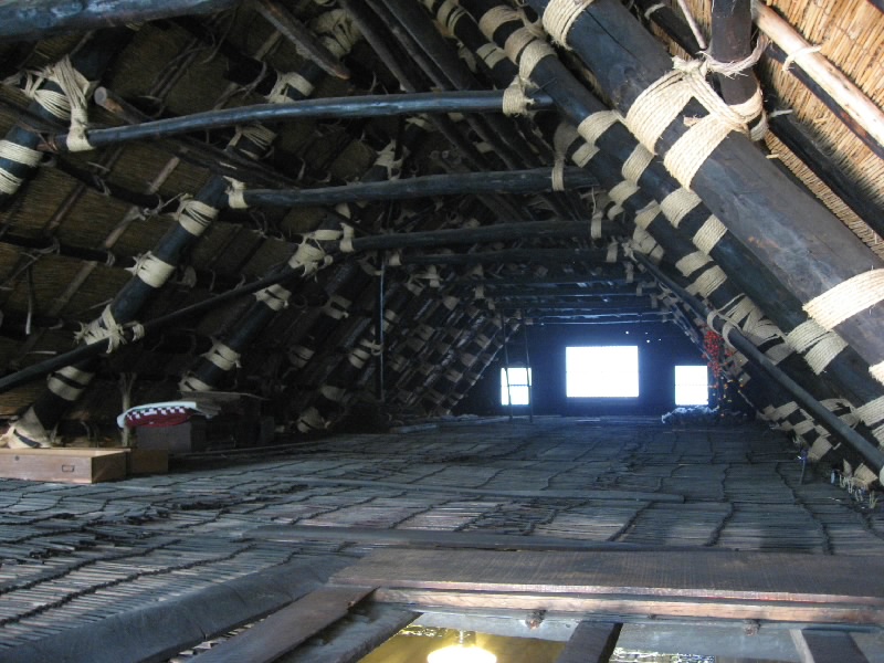 さて、急な階段を上がって2階へと行こう。2階はかなり広い。板張りの一部が網目のようになっているところがあり、下の囲炉裏から暖かい空気が入ってくるんだろうな。さらに屋根裏まで上がることができ、そこでは昔は養蚕が行われていたらしい。こうやって間近で見ると、釘を使わずに頑丈に作られている様子がよく分かる。唐辛子が干されていたり、かつて使用していた養蚕の道具があったりと、なかなか興味深い。