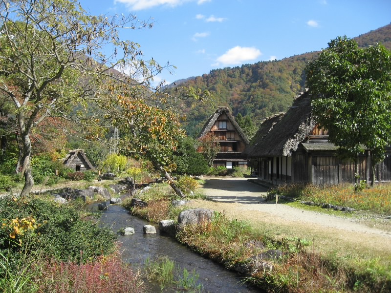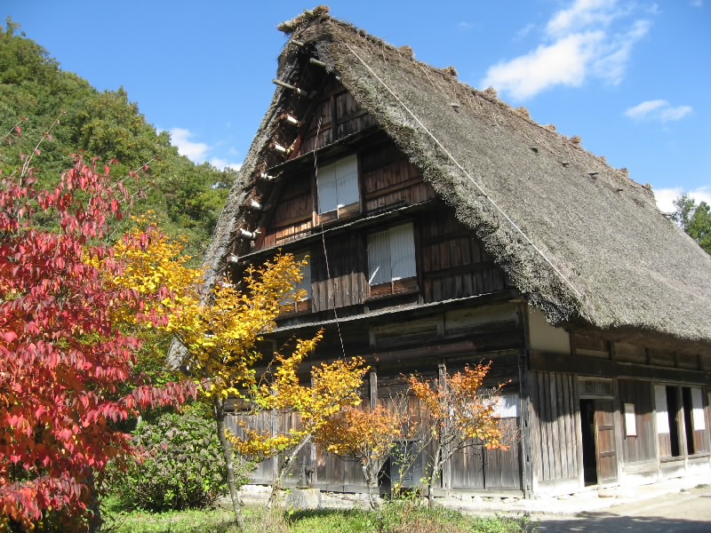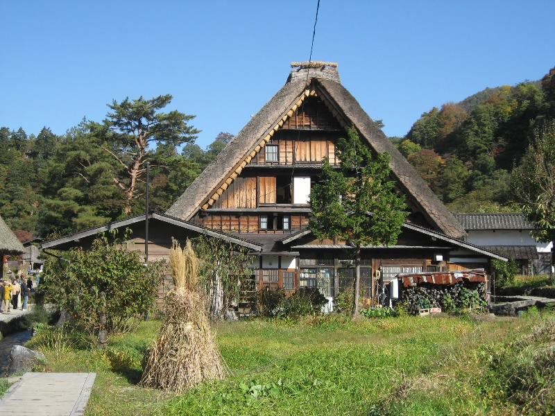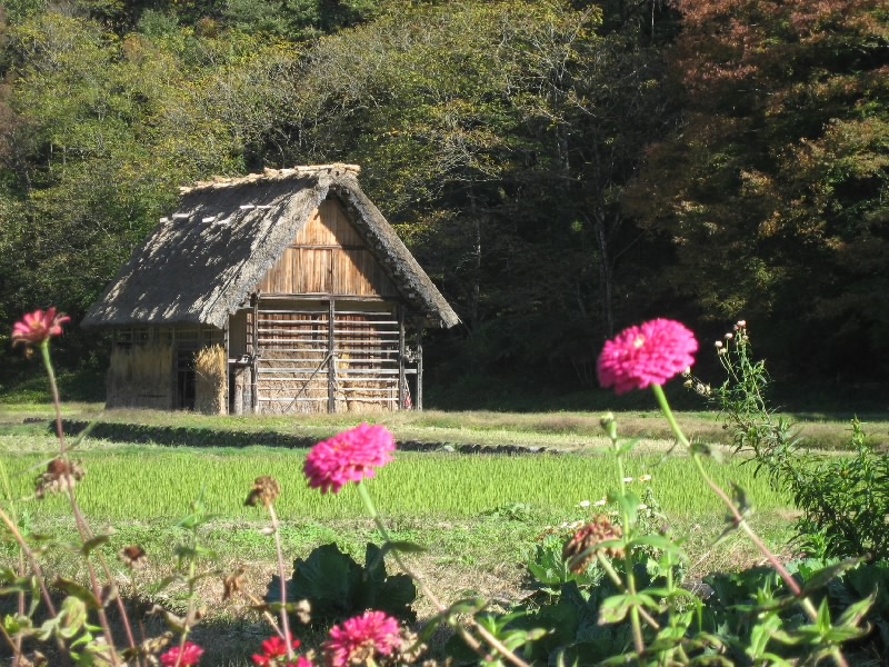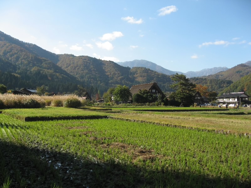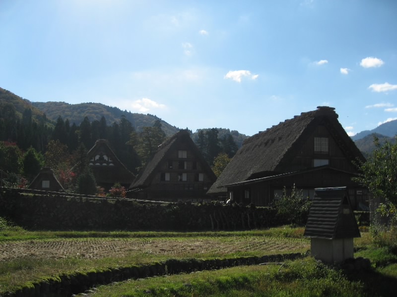 さて、出かけましょうか。チェックアウトして荷物を車にいれ、村歩きに出発だ。ホテルを出るときれいな青空。今日は気持ちのいい一日になりそうだな。もうすでに、たくさんの人が荻町集落の散策をしているようだ。日本人は朝早いからねえ。でもどんどん増えてくるんだろうなあ。合掌造りエリアに入ると、収穫の終わった田んぼが広がっている。久しぶりにあぜ道を歩いてみる。一体いつ以来だろう、懐かしい感覚だ。小学校以来かなあ・・・田んぼの置くには農具を置くような小屋があり、なんだか素朴ないい感じだ。稲が青い時期や収穫前もまた違った雰囲気になるんだろう。田植えの時期や雪の時期など、いろんな景色を見てみたいものです。