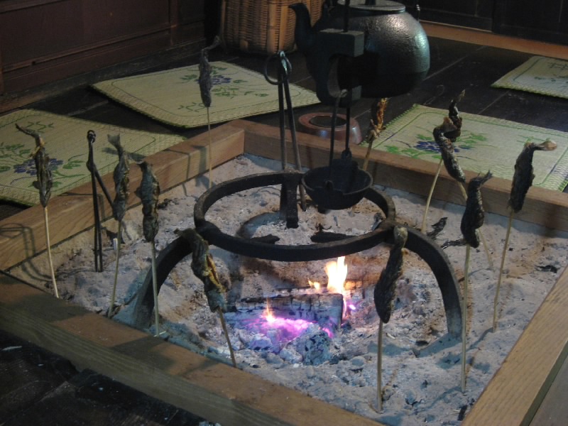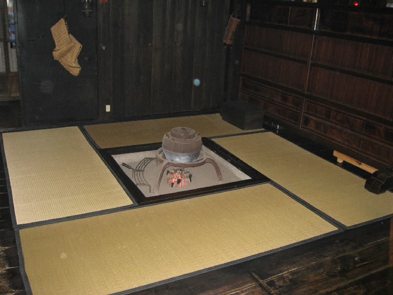 さて、村の中に入る。たくさんの合掌造りも、ほとんどは普通の生活が行われている民家。世界遺産になる前は、本当に静かなところだったんだろうなあ。ここ白川郷では、いくつかの民家が中を公開している。その中の一つ「和田家」に入ってみましょう。入場料300円がかかるが、まあ維持費もかかるだろうから仕方ないよね。中に入ると、すぐに囲炉裏があった。本物の炭火で暖かいぞ。これが部屋全体をジックリと暖めるんだろうなあ。2階に上がる階段の横には家族のプライベートエリアがあり、ここは当然立ち入り禁止。