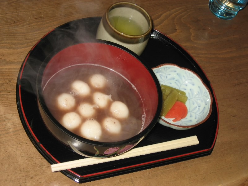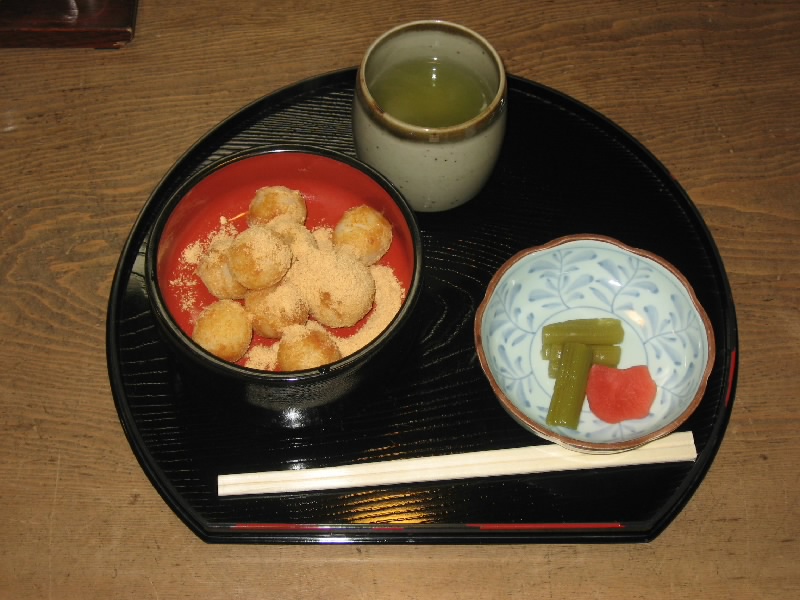 和田家を出て、再び散策しよう。少し川沿いの細い道を歩いていくと、宿泊できる合掌造りが並んでいるエリアに来た。もともと普通の民家なので、泊まれる部屋はどこも3部屋くらいで、外国人にも大人気らしい。ちょうど外国人2人が中に入っていった。靴脱ぐわ畳だわ布団だわで、なかなか異国情緒溢れる経験になるんだろうな。天気もいいし、紅葉もきれいだし、気持ちのいい散策だ。少し小腹がすいたな。合掌造りのお食事処、「今昔」へと入りましょうか。それほど広くはなく、結構賑わっている。カウンターに座り、あずき汁団子ときなこ団子をいただく。うん、素朴でおいしいな。お漬物を少しずつ食べながら、団子を食べるのがいい感じ。