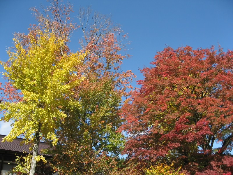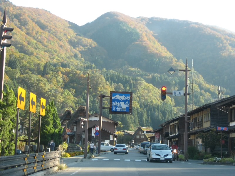 さあ、出発しましょうか。白川郷をあとにし、156号線とずっと走る。途中、バスは対向できないようなせまいトンネルがあり、ちょっと運転には気を使う。でもとにかく紅葉がきれい。西日を浴びて眩しく光る山がまるで燃えているように見える。きれいだなあ・・・1時間くらいで荘川ICに到着。ここから東海北陸道に乗り、一路高山方面へ。飛騨清見JCTから高山方面へ走るのだが、この道はいずれ松本と繋がるらしい。それはでも乗鞍越えの大工事だよね。地図やナビでは高山西ICで降りることになっていたが、その先にも道があるぞ。ナビにも載っていないこの道は9月にできたばかり。道もきれいだし、トンネルが妙に白い。そうか、トンネルは排気ガスで黒くなってしまうんだ。あっというまに高山ICに到着し、少し道に迷ったが途中でガソリンを満タンに入れて高山駅前のトヨタレンタカーへ。大阪から453キロ、無事に車を返却することができた。ここからホテルまでは5分ほど。今日の宿、桑谷屋に到着した。部屋に入って少し休憩。