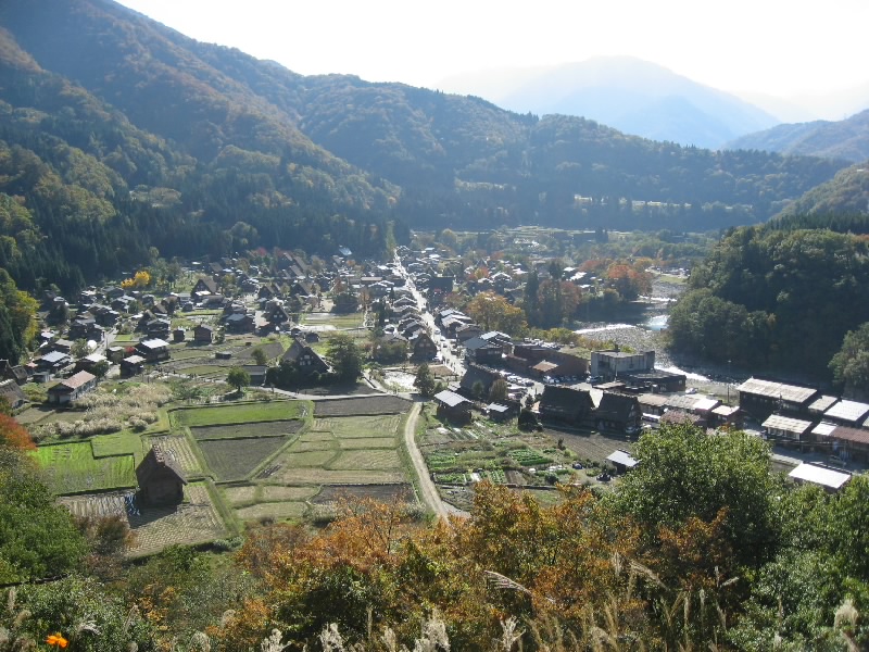 さて、展望台へ。荻町集落の脇から丘へと登る道がある。結構急な坂で、すぐに暑くなってきたぞ。なんとか登りきり、村を見下ろせる場所へと行く。うん、すばらしい。こうしてみると、今でこそ交通は便利になっているが本当に山あいの村なんだね。冬の間は雪に閉ざされるわけだし、独特な文化や風習が長い間守られてきたのも分かる気がする。紅葉の中の合掌造りが雰囲気があっていい感じだが、雪・桜・新緑など違う表情も見てみたいなあ。