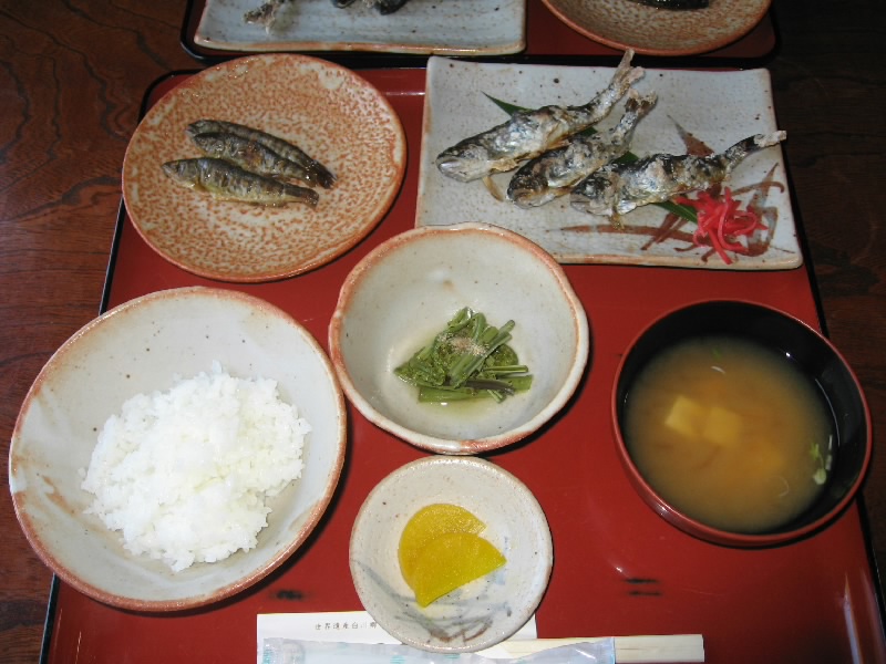 名残惜しいがそろそろ行きましょうか。展望台から村へと降り、お土産やさんで赤カブの漬物や地酒などのお土産をゲットし、車へと戻る。お昼時を少し過ぎた頃なので、まずはお昼ごはん。車で近くにある川魚料理の「文助」へと向かう。それほど広い店ではないが観光バスも停まっており、少し待ったが無事に入ることができた。団体さんのお膳がまだ片付けられていないのを見たのだが、それにしても・・・みんな食べ方ヘタクソ。これではいわなが可哀想だ。ちゃんときれいに食べてあげないとね。さて、どうしましょうか。いわなもいいが、もう2回食べているので今日はあまごにしましょうか。時期的に小さいらしいが、その分3匹つくということなのであまごに決定。じっくり焼くので少し時間がかかったが、あまご御膳登場。うん、確かに小ぶりだがちゃんと3匹乗っている。いわなより食べにくいかと思ったが、小さい分骨も食べられるし、焼立てでほくほくなのでこれもまた美味。甘露煮や山菜もおいしいし、山奥グルメもなかなかいいものですね。満足です。