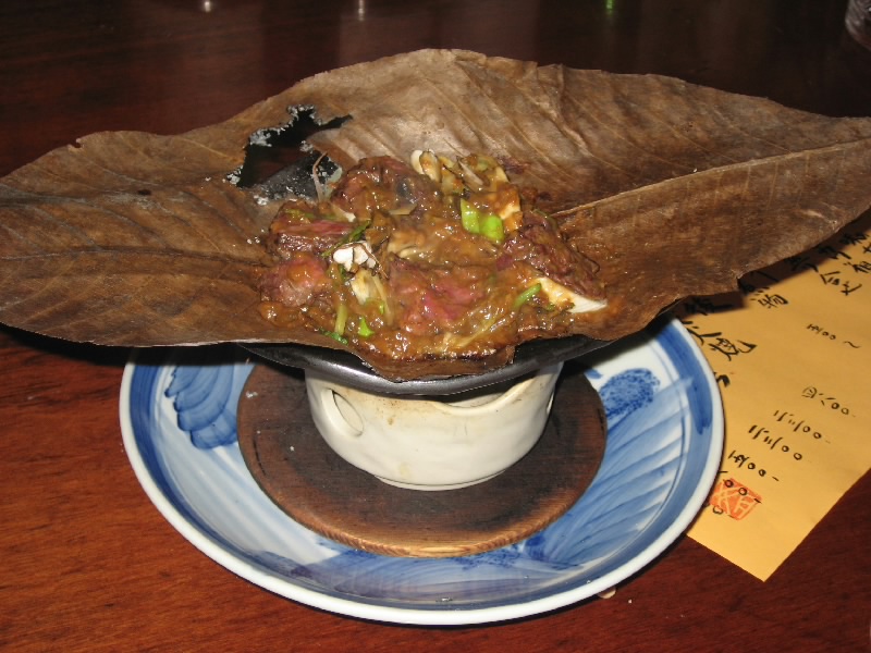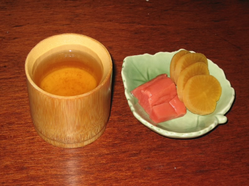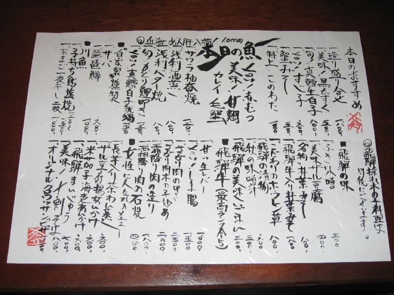続いては日本酒。お店オリジナルの「辛」というお酒とともに、お薦めの黒もずくとすじこをいただく。これが・・・うまい。もずくはシャキシャキとした食感で、こんなしっかりしたもずくは食べたことが無いぞ。そしてすじこ。これが実に日本酒によくあう。後味にふっと「卵」の風味が残り、こんなすじこは食べたことが無いぞ。これは日本酒が進む。ということで、おかわりいただきましょう。オリジナルの「山河」、そして追加であんきも。これもふわっとした舌触りに肝の旨味が口いっぱいに広がり、うまいねえ。高山は意外と日本海が近いようで、新鮮な魚介が楽しめるのだ。