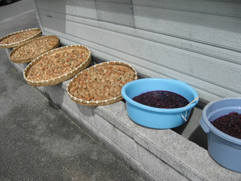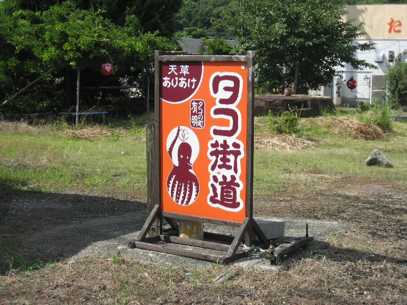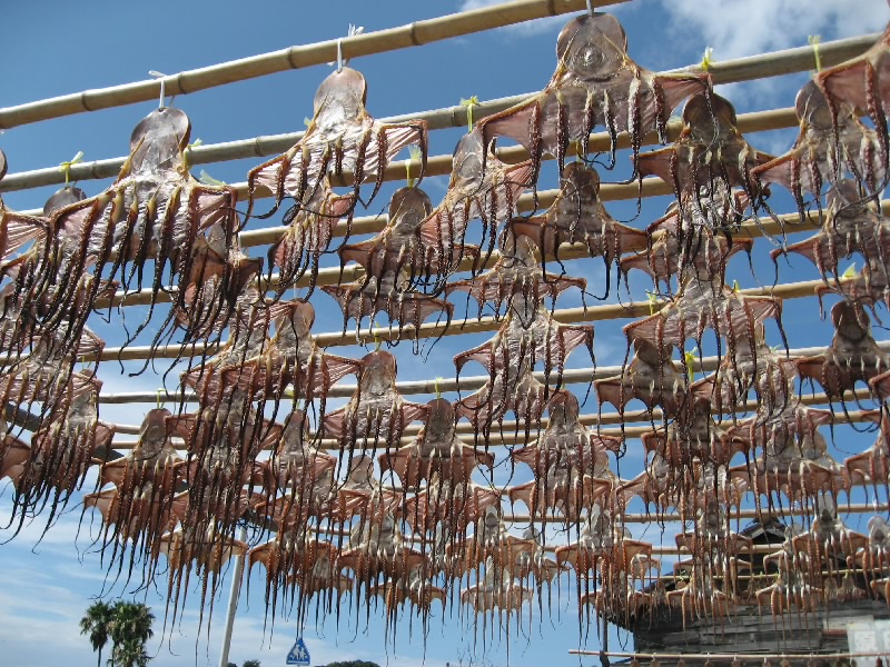 ドライブ再開。快晴の中、海沿いの道を快調に走る。途中、お土産やさんに立ち寄り、タコ飯のもとやタコステーキ、焼酎などをゲット。どんどん走ろう。タコ街道を走っていると、大量の干しタコを作っているところがあった。思わず車を止めて写真を撮る。これだけあるとなかなか壮観だね。