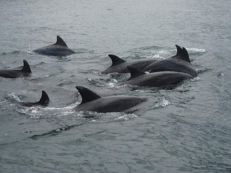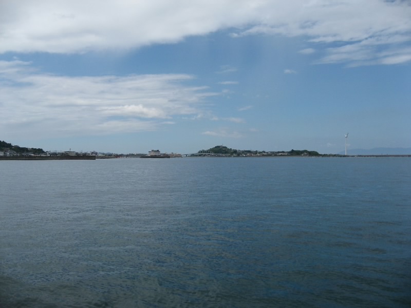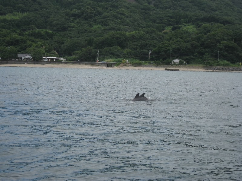 今日は土曜日ということもあり、他の場所からも結構多くの船が出ているようだ。ここからは3艘の船が出るのだが、指定された船へと乗り込む。さあ、出発だ!堤防から外へとでて、沖へと向かう。しばらく行くと、10艘以上の船が集まっているところがある。あそこかなあ・・・と思っているうちに、その船たちがスピードを上げた。なんだ?よく見ると、海面になにやら黒っぽいものが見える。イルカだ!数頭の群れが海面をはねるように泳いでいる。おお、それほど沖にでているわけではないのに、結構簡単に見られるんだね。天草と島原の間の海には、たくさんのイルカが棲息しており、ほぼ一年中この姿を見ることができるらしい。すごいなあ。ただ・・・船多すぎ。イルカが少し顔を出すと、10艘ほどの船がいっせいに動き出し、少しでも見やすいポイントへと近づいていくのだ。イルカの方にはそういう意識がないのかもしれないが、追いかけ回しているようでなんだか少しかわいそうになってくる。しかも力関係があるのか、この船の若い船長さんはなかなか割り込んでまでは近くに行ってくれないのよね・・・たまたま近くにイルカが現れたときはいいけれど、少し離れたところのイルカはすぐに他の船に隠れて見えなくなってしまう。それでも近くでジャンプを見せてくれたイルカもいたし、まだ小さな子供イルカを見ることもできた。で、もともと少し遅れてこの輪に入ったわれわれだったが、なぜか一番先に輪から離れて帰路に着く。もう帰るのか・・・と思っていたら、堤防の近くにイルカが集まっているポイントがあったようで、ようやく最後に来て間近でたくさんのイルカを見ることができた。あとから他の船もやってきたけれど、たくさん見られてよかったね。でももうちょっと人の少ない、せめて平日に来たほうがもっといいかもね。船着場に戻り、楽しいイルカウォッチングが終了だ。