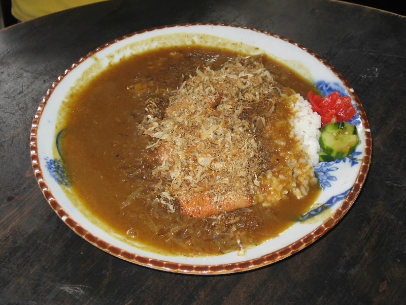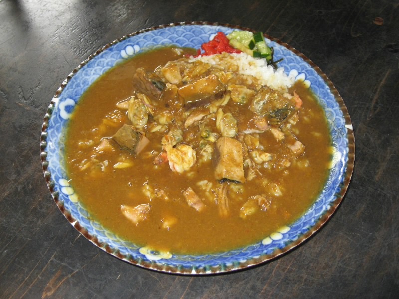 お腹がすいた。イルカウォッチングセンターのすぐそばにあるカレー屋さん、「珊瑚礁」へと入る。メニューがいろいろで迷ったが、せっかくなので2種類、天草カレーと珊瑚礁カレーを頼む。まずはサラダをいただきながら、カレーの登場を待つ。しばらくしてカレーが運ばれてきたぞ。天草カレーはヤリイカに鰯のつくねが入っていて、鰹節がたっぷりかかっている。珊瑚礁カレーは鰹の燻製にエビ、アサリなど、どちらも海の香りがたっぷりだ。少し辛めのカレーはフルーティーで南国風。さらっとおいしくいただきました。食後にイルカウォッチングセンターのサービスでソフトクリームをいただく。さて、暑くなった車に戻りましょうか。