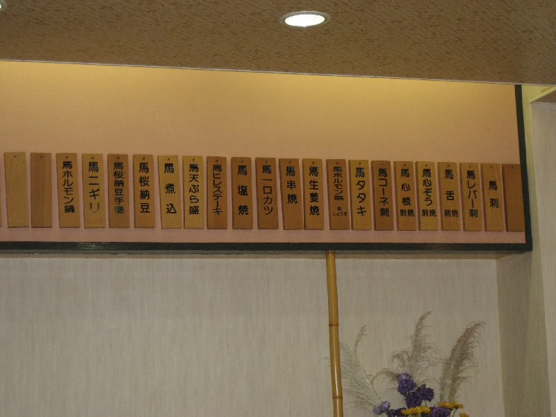 さて、もうすぐ8時。熊本のお楽しみ、馬刺しをいただきに行きましょう。昨年も行った「けんぞう」へと向かう。賑やかなアーケードの通りを抜け、地下のお店へと入る。中は満席で、予約をしていないととても入れない状態。前のお客さんがわれわれが来るまでということだったのかな、しばらくしたらカウンターが空いた。座ってしまえばこっちのもの、ではいろいろといただきましょうか。まずはビールで喉を潤す。そして突き出し、去年と同じく煮物がでてきた。これはきっと馬肉の切れ端なのかな、じっくり煮込まれたのか大根や厚揚げに味がしみていてすごくおいしい。やっぱりこの店はいいね。続いて熊本名物一文字ぐるぐる。しゃきっとした歯応えが好みです。ポテサラもおいしいしね。そしてここで最初のメイン、馬ホルモンと馬刺しの盛り合わせ登場。まずは馬刺しをいただきましょう・・・馬すぎ、いやうますぎ。甘いお肉が口の中でとろけるようだ。やっぱりうまいねえ。ホルモンは舌・心臓・肝臓・大動脈にコウネ、どれも臭みが全くなく、とろける舌触りやこりこりした歯応えなど、いろんな味を楽しめる。いいですね。ショウガ醤油やニンニク醤油、ゴマ油などいろんな風味も楽しめる。少し時間がたって柔らかくなったコウネもいいね。熊本の米焼酎とともに、おいしくいただく。続いては辛子蓮根。揚げたてほくほくのなかにツンとした香りがあり、これもまたいい。お酒が進みます。さて、もう少し馬をいただきましょうということで、馬串焼をいただく。少し酸味のあるソースとともにいただくのだが、これもうまい。どれも全くハズレなしだ。お腹が落ち着いてきたな。たまには魚もいただきましょう、ということで目の前にあったガラカブとやらをいただくことにしましょう。カサゴを天草地方ではこう呼ぶらしい。これがこんがりから揚げになって登場だ。こうなると身も骨もヒレも全部食べられてしまう。新鮮なだけあって、うまいねえ。