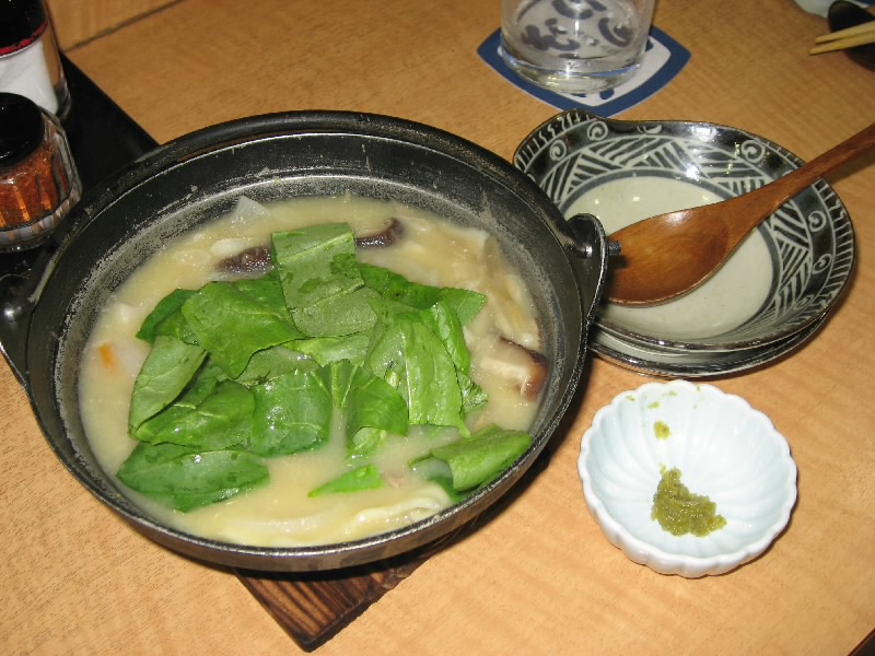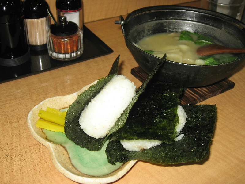そろそろシメかな。今回はだご汁をいただきましょう。いかにも郷土料理といった風情の汁物、これが具たくさんで甘めの味噌、心もからだもほっこりだ。柚子胡椒もあうしね。そしておにぎりをいただけば、これぞ完璧な熊本フルコース、満腹で大満足です。