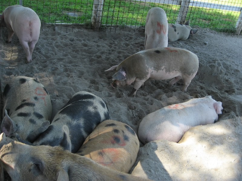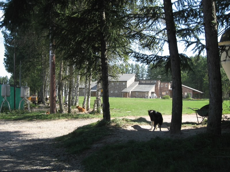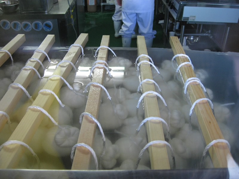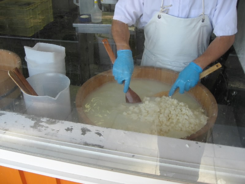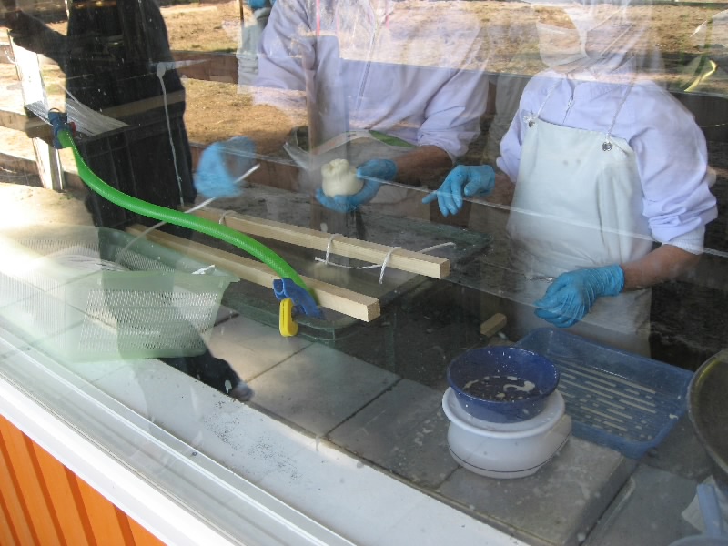 ショップを出ると、ちょうど観光バスが入ってきた。これはどんどん売れていくわけだ。少しでも早くこれてよかったな。話によると、夏休みは駐車場にもなかなか入れない状態で、せっかく入ってもほとんど買うものが残っていなかったりしたらしい。まあ今はちょっとしたブームかもね。少し奥へといくと、牧場エリアがある。ここにいたのがホエー豚。ついさっきおいしくいただいた豚たちだ。いろんな模様があるが、どれも臭くないし、きれいな肌をしている。ホエー入りのエサのおかげかな。その隣にはチーズ工房があり、外から様子が見える。温められた牛乳から乳脂肪の塊ができ、それが人の手で丸い形へと出来上がっていく。これはカチョカバッロかな。早く食べてみたいものだ。ちなみに、牛乳から脂肪分をとった残りの水分がホエー(乳清)。これが豚のエサになるのだ。工房のさらに奥は立ち入り禁止。向こうに見える豪邸が、義剛邸らしい。