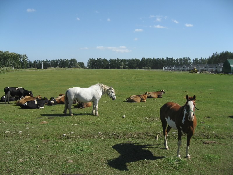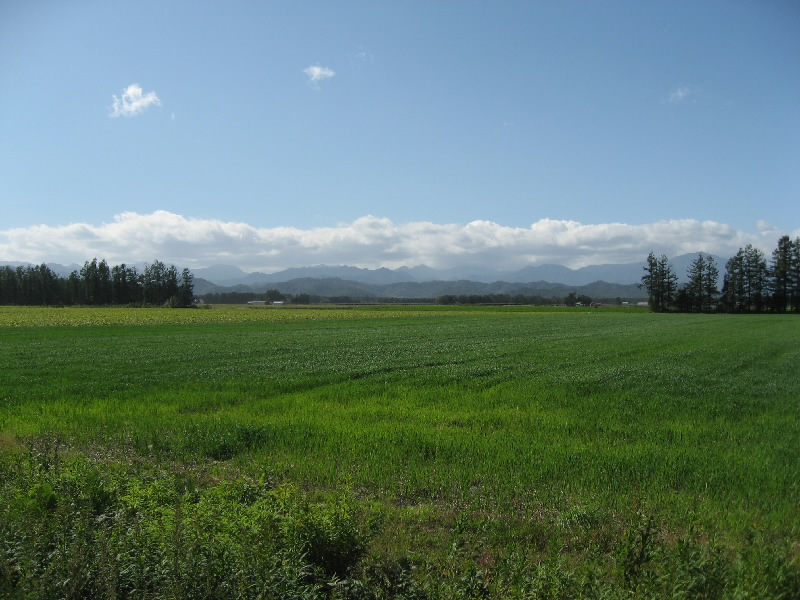 牧場を出て、散歩してみる。少し歩くと、十勝の大地が広がっている。真っ直ぐ伸びる道の両側に広がる緑の畑、その遠く向こうに十勝連峰。青空の中をゆっくりと流れる風が気持ちよく、この緑の中で大の字になって昼寝したい気分だ。でももう一ヶ月もするとこの辺りはそろそろ冬支度なんだね。牧場に戻り、たくさんの馬やロシナンテに別れを告げる。そろそろ行きますか。そんなときに、また観光バスが到着。ちゃんと買い物できるのかなあ、人ごとながら心配です。