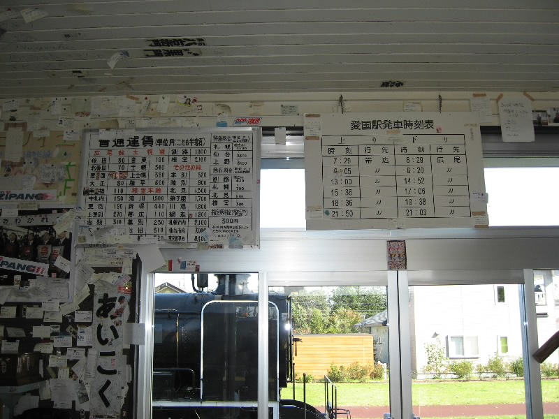 再び快適なドライブだ。途中、見つけた標識が「幸福駅」。昭和50年代から60年代に一大ブームとなった、広尾線の幸福駅〜愛国駅だ。縁起のいい駅名として全国から切符を求める人が集まったという。1987年に廃線となったのだが、今でも駅舎や当時の車両が残されている。駅の近くにはお土産屋さんがあり、幸福〜愛国間の切符のレプリカなどが売られている。鉄オタにはたまらないところだろう。まずは幸福駅に到着。当時の駅舎にはたくさんの名刺や定期券などが残されており、当時の様子が偲ばれる。幸福という駅名にちなんで、幸せの鐘が鳴らせるようにもなっている。当時の車両の中にも入れるのだが、板張りのクラシカルな車両だ。さて、ここに来たら「愛国駅」にも行かねば。少し車を走らせると標識があり、迷うことなく到着。幸福駅は昔ながらの駅舎だが、愛国駅は妙にきれいな駅舎。中はちょっとした記念館のようになっていた。広尾線の歩みや当時の様子などがよく分かる。当時の時刻表がそのままになっているのだが、一日6本しかなかったのね。廃線もやむなしか・・・ここには当時の蒸気機関車が展示されている。雪の大地を力強く走る蒸気機関車、絵になるね。一度見てみたかったな。