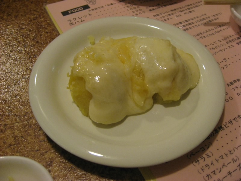 今日も屋台へと行こう。まだ6時半と少し時間は早いが、昨日のようにジャガイモラクレットがなくなったら大変だしね。北の屋台へと行くと、昨日とはうって変わってほとんどの屋台が営業している。やっぱりこういうほうが賑やかでいいね。どこへ行こうかと一通り見て回ったが、やはりまずはPetit Plasir。おや、また来ましたねといった感じでご主人が迎えてくれた。早速中に入り、奥の席につく。今日はまずはビールで乾杯し、昨日と同じく生食とうもろこしなどの突き出しをいただく。喉に染み渡るビールと、シャキッとしたとうもろこしがいい感じ。そしてオーダーするのは、昨日のリベンジ、ジャガイモのラクレット。今日はさすがに時間が早いので、ほくほくジャガイモがあるようだ。これにとろりと十勝チーズをたっぷりかけて、熱いうちにいただく。うーん、やっぱりジャガイモの方がおいしいねえ。北海道の北あかりなので、まさに北海道の味わい、絶品です。続いてはピザをいただく。パリッとした薄めの生地で、こういう屋台にしてはなかなかおいしいピザだね。
