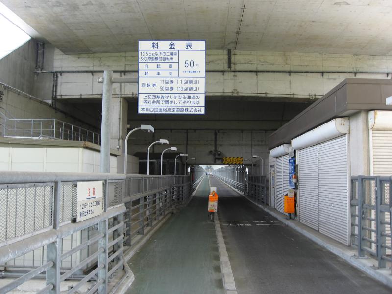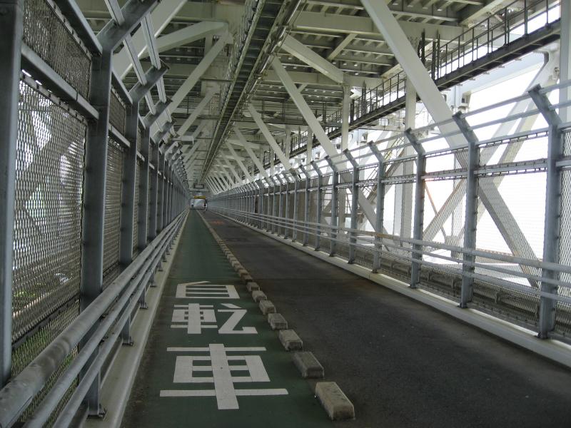 新尾道大橋を渡り、向島の緑の中を快適に走る。ほどなく次の橋、因島大橋が見えてきた。これは長さ1270mのかなり長い橋だ。両側にキラキラ光る海を見ながら、気持ちよく走り抜ける。因島に着くとすぐに大浜パーキングエリアがあるので、まずはここで休憩だ。ここからは遊歩道が伸びていて、因島大橋を見渡せる展望エリアがある。天気もいいし、気持ちがいいな。この橋はしまなみ海道の中では比較的古く、1983年から供用されている。この橋ができて、このあたりに住んでいる人の生活はずいぶん変わっただろうなあ。しまなみ海道の橋はすべて歩いてわたることもでき、因島大橋は車道の下を自転車や歩行者が渡れるようになっている。なので自転車通学で尾道までといったこともできてしまうわけだ。やっぱり便利なのがいいよね。その歩行者用道路も少し歩いてみる。一直線なので、自転車で一気に走るのも気持ちいいかもね。