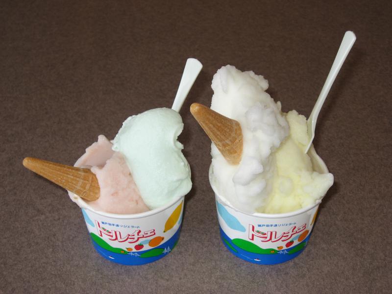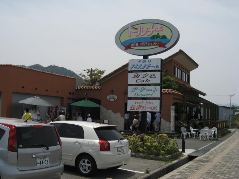 さて、行きますか。因島を抜け、1991年にできた790mの生口橋を抜けるとそこは生口島。ここの生口島北インターで一旦しまなみ海道を降りる。この島には有名なジェラートやさんがあるので、ぜひそこに行きたいのだ。海沿いの道を走るとしばらくして、そのジェラート屋さん「ドルチェ」に到着。結構広い駐車場だが、お店は意外とせまくにぎわっている。カップのダブルを2つ、よって4種類のジェラートが選べる。いろいろあって迷ったが、「尾道の桃」「伯方の塩」「デコポン」「はるか」を選ぶ。はるかはこのあたりで取れる柑橘類で、少し苦味があってなかなかの美味。季節限定だしね。うーん、どれもおいしいぞ。でもやっぱり伯方の塩がいいかなあ、いや柑橘系の爽やかさもいいし、桃の甘さもいいし・・・自然なものからできているので変に甘すぎず、すっきりおいしいです。お店の中には、因島出身の東ちづるとポルノグラフィティのサインがあった。ここのジェラートは楽天でも取り寄せできるので、いろいろと食べてみたいな。