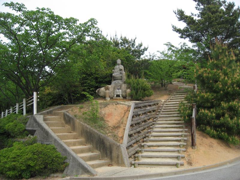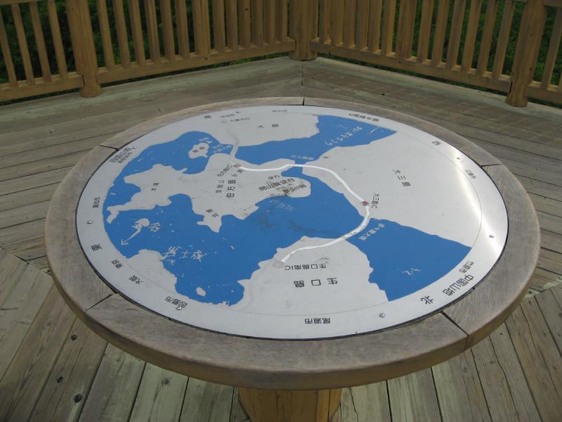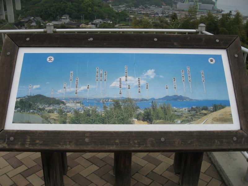 道の駅でお土産を見てみたが、特にここで買うものはなかった。さて、行きますか。大三島インターでしまなみ海道に戻り、1979年に最初に開通した328mの大三島橋を渡って伯方島へ。伯方島インターで三たび降り、開山展望台へ。これといった標識もないし、車の通りもないのでどうかと思ったが、どんどん山道を登っていくと急に開けた場所があり、駐車場があった。ここからはさっき渡った大三島橋を見えるぞ。ここから階段でもう少しあがっていけるので行ってみましょう。登りきったところには、木組みの展望台があった。この展望台をさらに登ると、周りがぐるっと見渡せる。通ってきた多々羅大橋に、これから通る伯方・大島大橋も見える。もう少し空が青ければもっといいのだが、静かでいい景色だ。人がまばらな展望台も、静かでいいものだね。