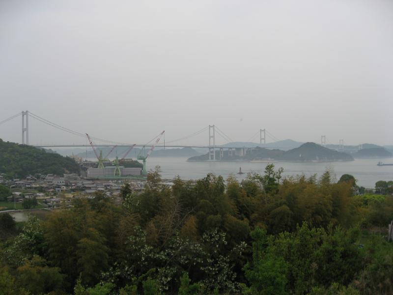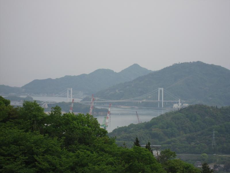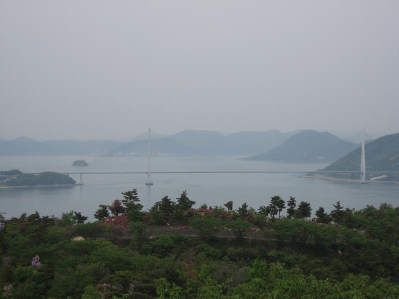 しまなみ海道に戻り、1988年開通の1230mの伯方・大島大橋を通る。そして大島を抜け、いよいよ最後の橋へ。四国本土に繋がる来島海峡大橋は3つの橋が連なっており、合計4045mの長い橋だ。美しい橋を一気に走りぬけると、いよいよ四国に上陸。最後のサービスエリア、来島海峡サービスエリアで車を止め、来島海峡大橋を眺める。さっきよりもさらに雲がかかってきたようではっきりと見えないのは残念だが、尾道から無事に渡ってこれてよかった。それにしてもこんなに立派な橋を造ってしまうなんて、日本の技術は凄いもんだ。本州と四国をつなぐ結ぶ3本のルートのうち、少しずつ止まりながら景色を楽しめるのはこのしまなみ海道なんだろうな。今治インターを降り、これにてしまなみ海道は終了。楽しかったな。
