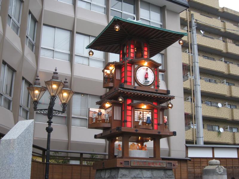 道後温泉の前からはお土産屋さんなどが並ぶ道が伸びている。ここは道後ハイカラ通りと呼ばれ、お店を見ながらぶらぶらと歩く。柑橘系のジュースやお菓子など、よさそうなものがいろいろとあるね。まあ今は見るだだけど。アーケードの道をずっと歩くと、道後温泉の駅前にでてきた。松山市内をくまなく走る市電だが、駅舎がレトロでいい感じ。その前にはからくり時計があって、30分に一回仕掛けが動き出す。ちょうど動き始めたところなのでみていると、時計がせりあがって中から坊ちゃんやマドンナ、赤シャツやうらなりなどが出てくるぞ。坊ちゃんは昔に読んだことがあり、なんとなくは覚えているが・・・多くの観光客が見守る中、時計は元の姿に戻った。