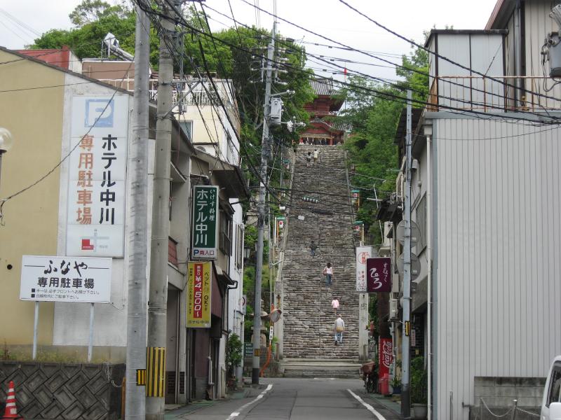 一旦ホテルに戻り、買ったばかりのお土産を預かってもらう。ホテルの近くには伊佐爾波神社があり、100段をゆうに越える石段を登るとそこには社殿が。ここは300年以上前に、石清水八幡宮を模して建替えられたらしい。静かな境内からは、遠く松山城まで見渡すことができる。手前に見えるのは今日泊まる「ふなや」だ。この階段の下に猫がいたのだが、われわれが階段を登るとなぜかついてきて、神社にいる間ずっとそばにいた。なんでだろう。