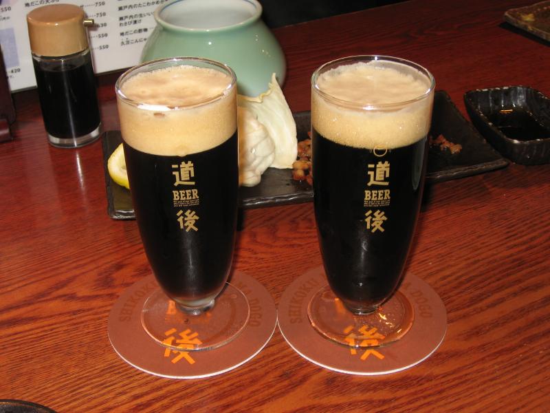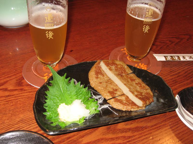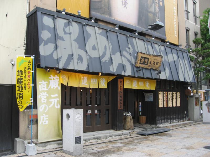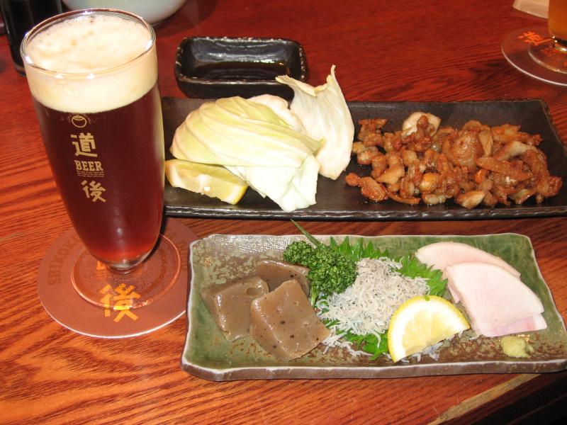 まだ2時前。ホテルに入れるのは3時以降なので時間がある。おやつにしますか。昨日も少し飲んだが、ここは再び道後の地ビール。道後温泉近くの道後麦酒館へ。こんな中途半端な時間なのに、結構賑わっていた。風呂上りに一杯、という人が多いんだろうな。ちょうどカウンターが空いていたのでまずは「坊ちゃんビール」を頂く。これはケルシュタイプといわれるもので、一番絞りの麦汁のみを使用したすっきりビールで、のど越しさわやか。つまみはやっぱり宇和島のじゃこ天かな。うまいです。さて、続いては「マドンナビール」。これはアルトタイプで、良質モルトをたっぷり使った豊かな風味が特徴。少し香ばしい味わいが伊予地鶏の皮焼きといい感じ。追加で釜揚げちりめん・久万コンニャク・城川町のハムと大根をいただき、ゆったりと楽しむ。とはいえ酒はなくなるもの。地ビールは3種類なので、やっぱり行くべきでしょう。最後は「漱石ビール」。これはスタウトタイプで、コクがあり独特な香りと苦味があってシメにいい感じ。ギネスよりは少し軽い感じかな。満足満足、いいおやつでした。