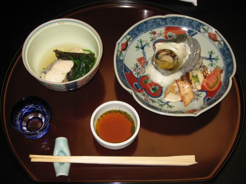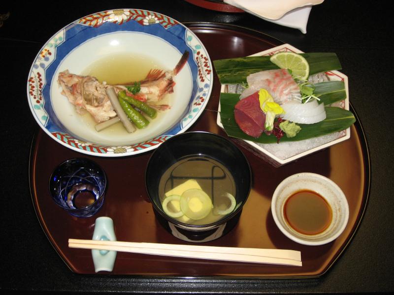まずは食前酒のレモン酒をいただき、先付は穴子とタコの2種類。野菜もいろいろと入っていて、梅肉ソースなどが冷酒ともあう。刺身はいかにも新鮮な味わいで、イカの甘みがなんともいいねえ。焚き合わせでは小魚が丸一匹でてきたので、骨だけ残してきれいにいただきましょう。今日は仲居さんにきれいに食べたことを褒められていました。いいことです、供養です。