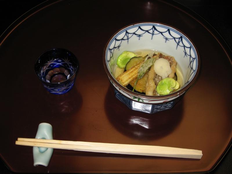 揚物・・・小鯛揚げ出し 茄子 ヤングコーン 一寸豆 新芽茶 生姜おろし 美味出汁