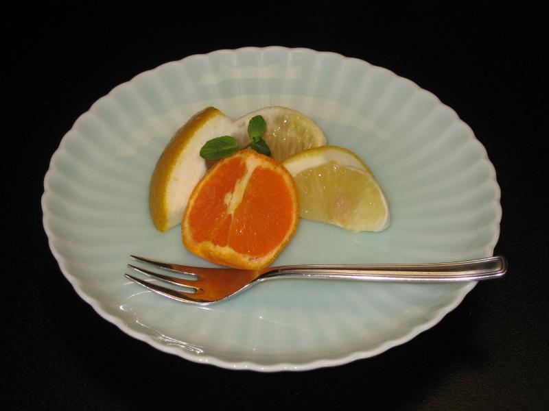 そして最後はデザート、柑橘三種。愛媛は一年中何か柑橘類が取れるとのことで、今の時期は美生柑・カラマンダリン・ニューサマーオレンジが旬とのこと。少し皮が厚くてほろ苦い美生柑、みかんに似たカラマンダリン、そして酸味が爽やかなニューサマーオレンジ。三種三様、でもどれもみずみずしくて最高のデザートとなった。ということは、また違う季節にも来て見ないとね。今日は瀬戸内の恵みをたくさんの種類いただいたが、それも季節によって変わるだろうしね。