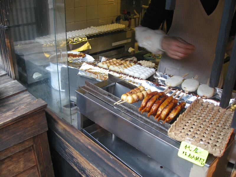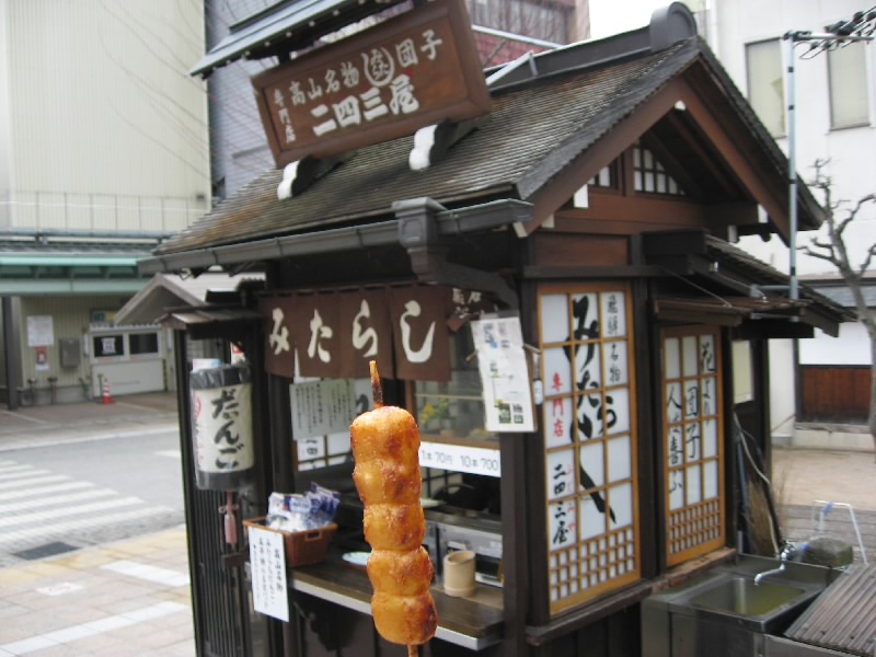 酒蔵を出て、再び町歩き。お酒が少し入っていい感じ。通りをひとつ川に近い道に入ると、たくさんのお店もあって賑やかな通りだ。ここでまたみたらし団子屋台に出会ってしまった。お酒を飲んだ後ということもあり、この香ばしさには妙に惹かれる。これは是非ともいただきましょう。うーん、やっぱりうまいねえ。一本70円と安いし。