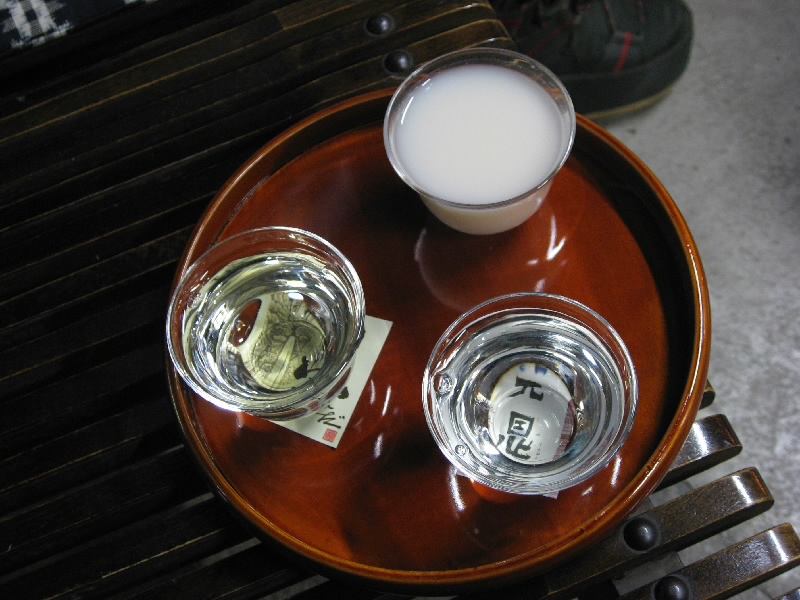 すぐにわれわれの順番が来たぞ。お米を洗って、蒸して、絞って、仕込んで、熟成して。言葉にすると簡単だが、大変な重労働だろうな。一通り説明を受けたあとは、原酒の試飲を頂く。少し度数が強く、香りのしっかりしたおいしいお酒だ。さて、せっかく来たのでお酒を買いたい。他にも種類があるので、やっぱり試飲をしないとね。ここは観光客も多いせいか試飲は残念ながら有料だが(400円)、お猪口にたっぷりと3種類もいただける。にごり酒の「飛騨路」純米の「山ひだ」そして本醸造の「天恩」。うーん、ちょっと多すぎる位のこの試飲、すっかりゴキゲンになったおじさんもいるぞ。3種類飲み比べ、どれもおいしいが家で飲むには「天恩」かな。ゲットです。