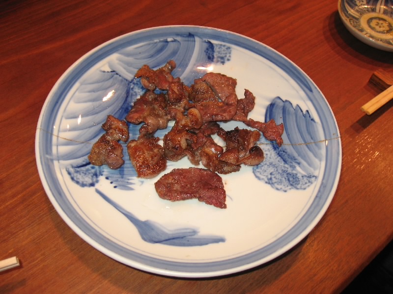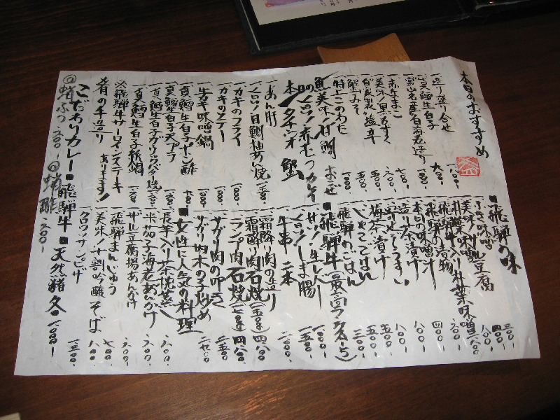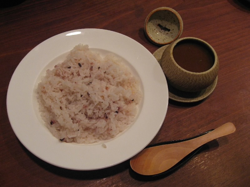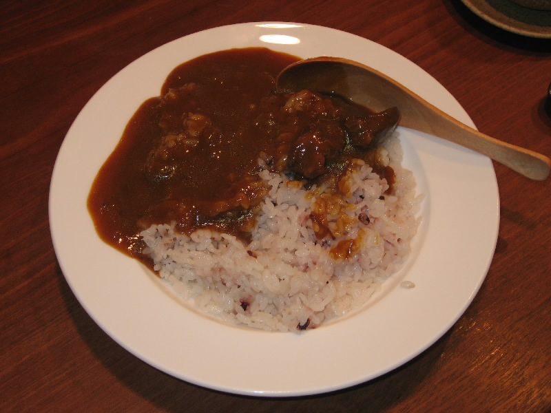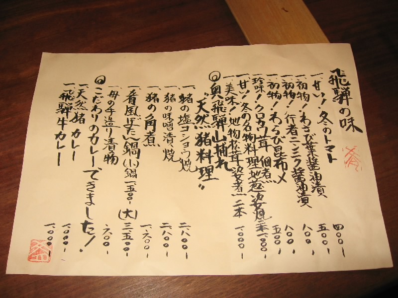 さて、そろそろ後半戦。飛騨牛と行きたいところだが、それは他でも食べられる。この店での冬の味覚といえば、奥飛騨の天然猪。牡丹鍋は食べたことがあるが、新鮮な猪肉なのでシンプルに塩コショウ焼でいただく。少し時間がかかったが、じっくり焼かれたその肉は歯応えがあり、噛むほどに肉の甘みが口全体に広がりとてもおいしい。なんでも冬が遅かったためにたっぷりとドングリを食べた猪はこういう甘い味がするらしい。臭みも全くなく、これは都会ではなかなか食べられないねえ。じっくりと味わいながら、登場したのは地葱の姿焼き。中からとろっと熱い旨味が出てくるので、やけどに注意だね。ふう、これでかなり満足かな。そろそろ締めということで、ご主人お薦めの猪カレー。猪肉がたっぷり入ったカレーを五穀米にかけていただく。さらっとしたルーだが、だしがしっかりと効いているのが分かる。うまいぞ。カレー好きには至福のカレー締め、おなかいっぱいです。最後にお手製の漬物をいただきながら、熱いお茶でほっと落ち着く。前回は秋、今回は冬とお薦めで食べられるものは随分違うが、それぞれがおいしい。こうなると春や夏にも来てみたくなるね。ご主人にはこだわっていてほしいものです。
