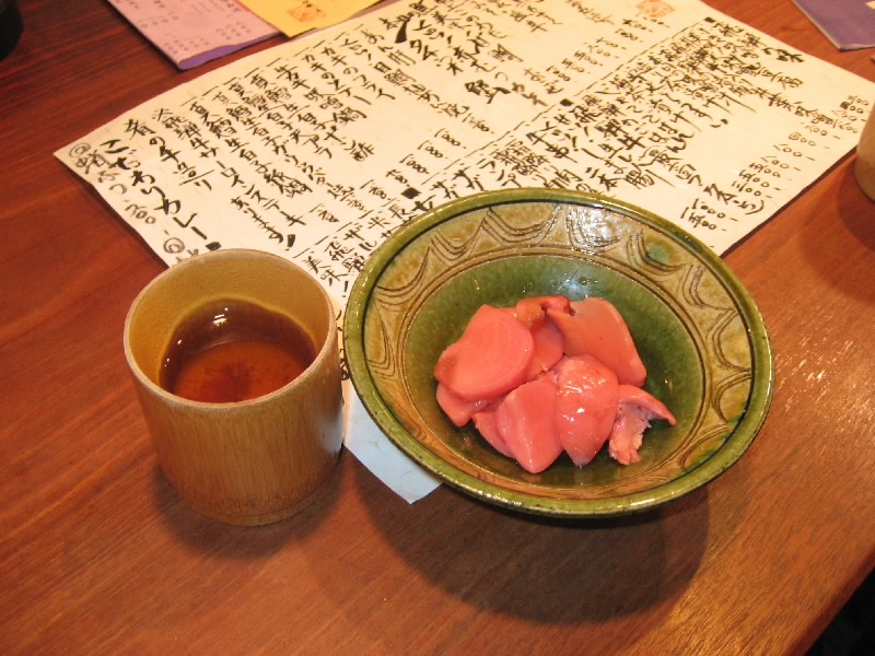 少しうとうとしたかな。さて、起きますか。今日の晩ごはんは前回も行った「肴」。19時の予約なので、そろそろ出かけましょう。外に出ると、結構雨が強く降っている。うーん、ここは普通雪だよね。妙に暖かい雨の中、お店に到着。中に入ると、見覚えのあるご主人に一番奥のカウンターに案内された。これは落ち着くね。1年半ぶりのこのお店、相変わらずご主人のこだわりメニューが並んでいるようだ。とりあえずはクーポンのサービスで、手作り果実酒をいただく。少し甘みがあっておいしい。まずは突き出し3種類。なめこ・やまいもそして名前を忘れたが緑色の海草。どれも素材感がいい感じ。さて、何にしようかな。前回はもずく・あんきも・すじこが絶品であったが、今は季節が違い、あまり良くなかったりそもそもなかったりとのこと。ということでお薦めの山菜類と自家製塩辛をいただきましょう。山菜はわさび葉醤油漬け・蕗煮物・行者にんにく醤油漬け・わらび昆布〆。独特の風味を持つ山菜たちに春を感じながら、本醸造の「辛」と純米吟醸の「山河」を味比べしながらいただく。これは進みますねえ。期待通りのいいスタートです。自家製塩辛は辛すぎず、新鮮なイカの風味がまたいい感じ。