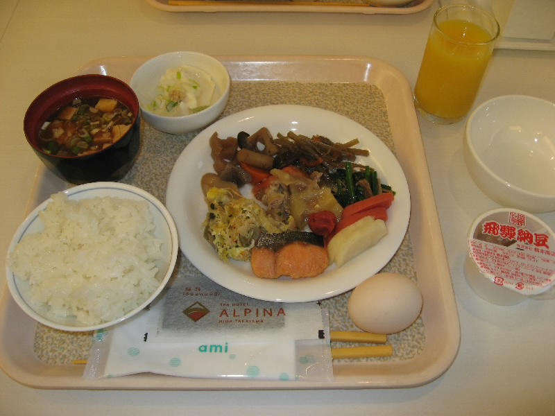 6時起床。ぐっすり眠れたぞ。さっそくホテル最上階にある、大浴場へ行こう。新しいホテルなので窓も大きく、気持ちのいい温泉だ。それほど人がいないのでゆっくり入れるしね。外には露天風呂もあり、外の寒さと温泉の温かさが気持ちいい。本当はもっと雪景色を見ながらなんだけどね・・・さっぱりした。部屋に戻って準備をして、1階のレストランへ。ここは和洋食のバイキング形式だ。飛騨の食材を使ったいろんなおかずがあるのがいいね。和食をきっちりと食べ、デザート代わりに洋食を食べ、満腹。エネルギー補給はばっちり、ごちそうさまでした。