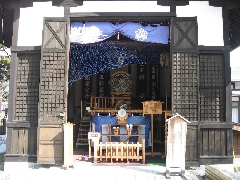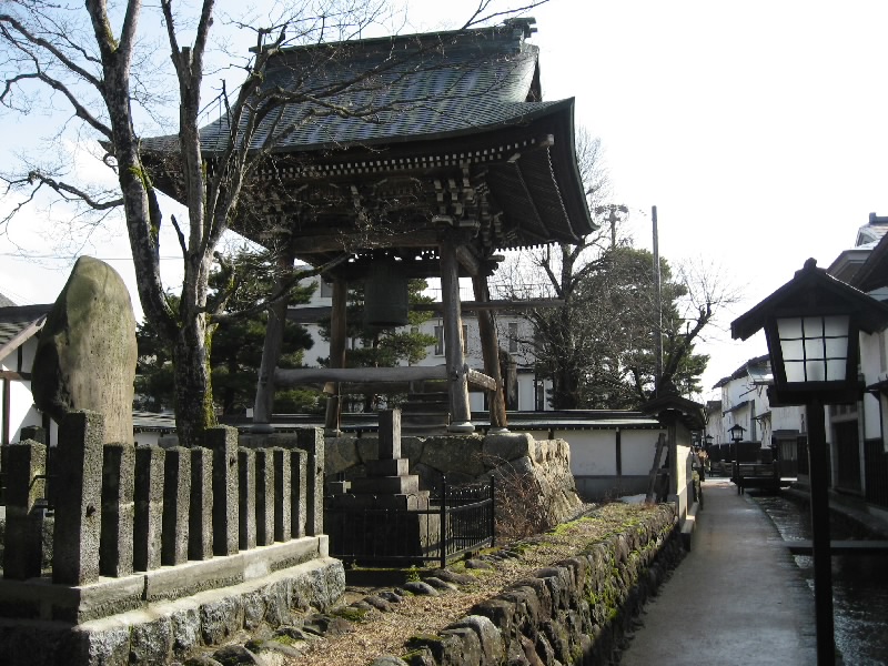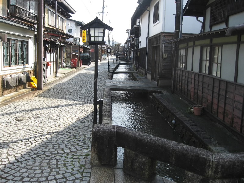それにしても暖かい。若干雪が残っているところもあるが、もう春だ。さて、散策しますか。駅からしばらく歩くと、古い町並みエリアにやってきたぞ。石畳の道に、脇を流れる水路。ここには錦鯉がいるはずだが、今はなぜか全くいないぞ。冬眠中なのかな?昔ながらの白壁と黒板の土蔵が続く道にはあまり人通りがなく、ぶらぶら歩くのが楽しい。酒蔵もあるようで、その裏を通ると仕込み中のお酒の匂いがするぞ。しばらく歩くとお寺の脇の細い道、ここを抜けると広場に出てきたぞ。飛騨古川祭り会館があり、その隣にある建物の中には祭で使われる太鼓が飾られている。4月には勇壮なけんか祭りが行われるらしい。この静かな街が盛り上がるんだろうな。さらに歩こう。広場から少し離れると少し広い通りにでるが、ここも昔ながらの家並が続いている。