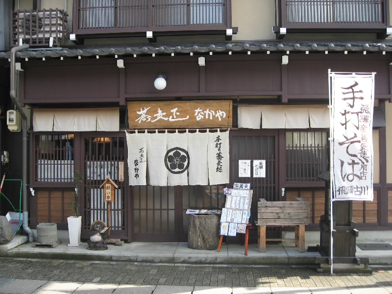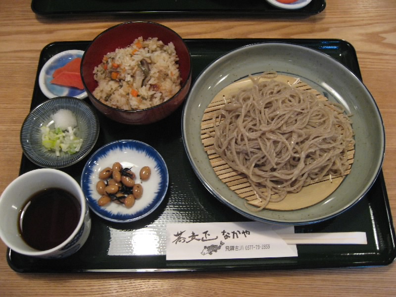 そろそろおなかがすいてきた。そば屋ののぼりが幾つか見えるので、ここはそばをいただきましょう。「なかや」という店に入り、飛騨ざる蕎麦セットを頂く。そばと舞茸ごはん、小皿のセットだ。しばらくすると、おいしそうなお蕎麦がでてきたぞ。そばつゆもいいが、お店の人のお薦めは塩。テーブルの上には赤みがかった塩があり、これをぱらぱらとかけて食べてみる。口の中では少し甘みのある塩けが蕎麦にいい感じで広がり、なかなかの美味だね。そばつゆと交互にその味わいを楽しむ。舞茸ごはんに蕎麦湯までしっかりいただき、ごちそうさまでした。