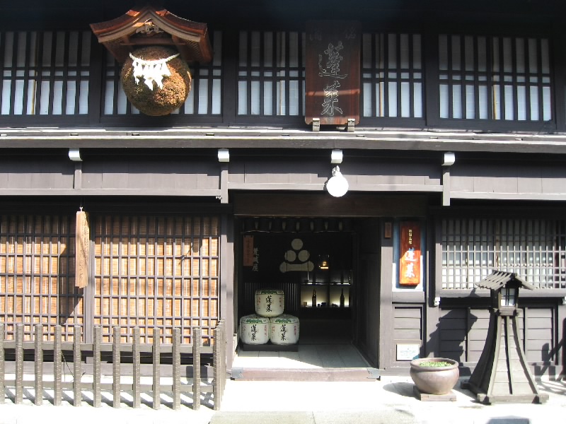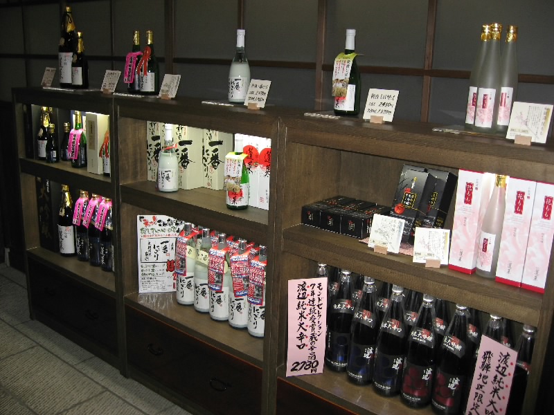食後にはやっぱり酒蔵でしょう。さっき通った昔ながらの家並の中にはいくつか酒蔵があるが、その中で結構大きな建物の「蓬莱」という酒蔵に入ってみる。中にはいろんな種類のお酒がおいてあり、早速試飲をさせてくれた。今年の新酒がさわやかで、実にうまいぞ。純米吟醸もいい感じ、というわけで2本ともいただきましょう。酒処の飛騨ではおいしいお酒がたくさんあるね。