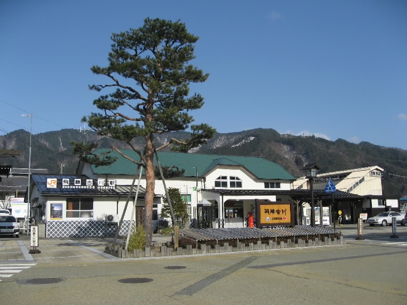 ホテルをチェックアウト。もう一泊したかったけどね。今日の宿、高山駅前にあるカントリーホテルへ移動する。荷物を預かってもらい、これで身軽になったぞ。さて、今日はゆっくり時間があるので少し足を伸ばして飛騨古川へと行こう。駅で時刻表を見ると、なんと数分前の10:15に出たばかり。それはまだしも、次の電車は12:30。え、そんなにないの?せめて1時間に一本くらいはあると思っていたが・・・どうしようかと思ったが、目の前にはバス停、ちょうど10:40発があるのでこれで行きましょう。電車よりは時間がかかるのだが、それでも40分弱で飛騨古川駅前に到着。ぽかぽか陽気の中、妙に暑い車内だったのでバスを降りて外の空気が気持ちいい。とにかくまずは帰りの電車チェックをしないとね。15:11か15:50かな。それを逃すと17:18なんでね。