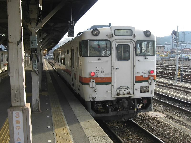 ほろ酔いでいい気分。小さい街なので、散策は一通りしたかな。天気はいいし、暖かいし、しばし広場でのんびり過ごす。そろそろ行きますか。駅に向かう途中にスーパーがあったので、中に入ってみる。普段見るスーパーとは少し違う野菜や魚がおもしろい。やっぱり肉は飛騨牛なのかな。駅に着くと、すでに電車は来ていたがまだ改札前で入れない。なんとものんびりしたものだ。少し駅前をぶらぶらしているうちに、改札が始まった。ホームにはたった1両の電車がいた。高山までは20分もかからない距離だが、ずっとがらがら。本数が少ないわけだ・・・高山に到着し、朝荷物を預けた駅前のカントリーホテルへ。預けた荷物を受け取り、部屋に入ってちょっと休憩。