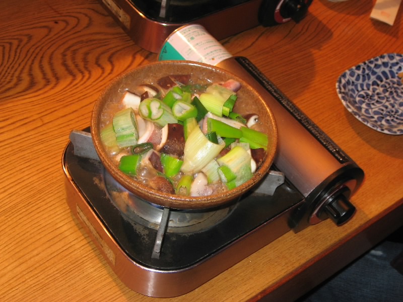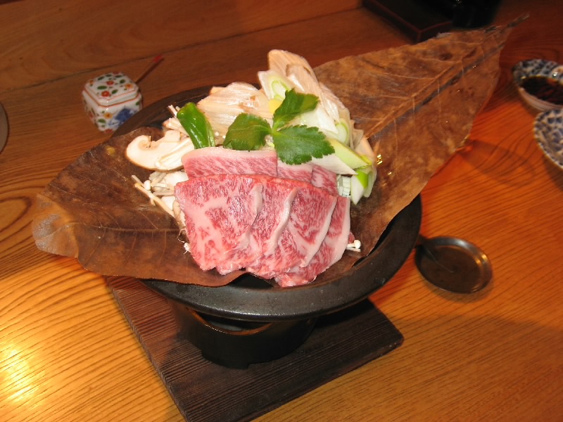 さて、もう一つ温かいもの、イカのワタ焼き。新鮮なイカと野菜をイカのワタ入りのダシでグツグツと煮込むのだ。半生くらいで食べればと思ったが、お店の人によるとしっかり煮たほうがいいとのこと。色が変わり、もう少ししたら焦げるかも、というくらいでいただく。ホクホクになったイカにワタの濃厚な味が纏わりつき、これも美味。はふはふと食べていると、なんとお店の人のサービスでホタルイカ投入。イカ同士で、そりゃうまいよね。お酒のおかわりもいただきましょう。そしてそろそろ飛騨牛へと行きましょう。朴葉焼きを頼んだところ、思ったよりもボリュームのあるものがでてきた。いいね。火をつけ、ジックリと出来上がりを待つ。グツグツとしたところで肉を返し、野菜と味噌を混ぜ、ちょうどいい感じになったところでいただく。やっぱりうまいねえ。飛騨高山、海と山の幸がどちらもしっかりと楽しめ、いいところです。