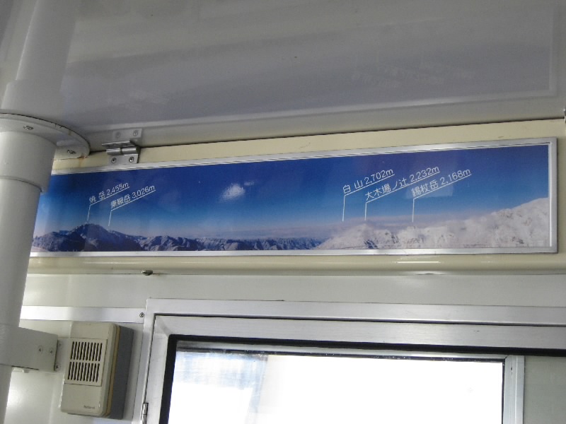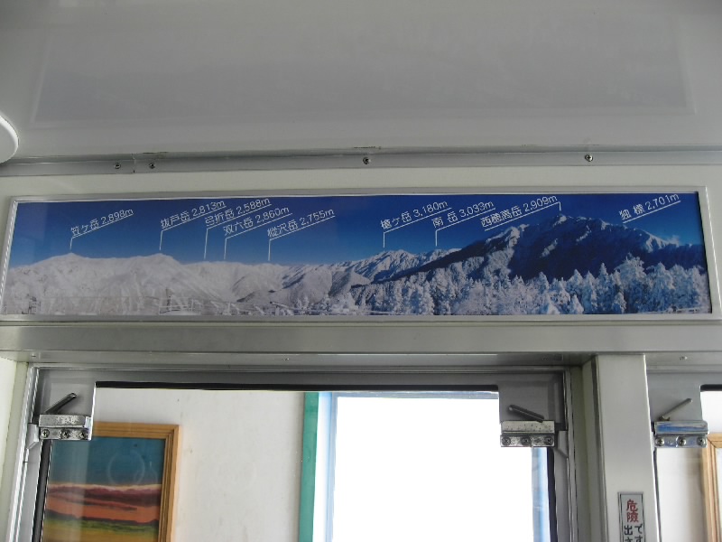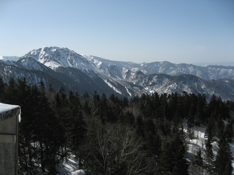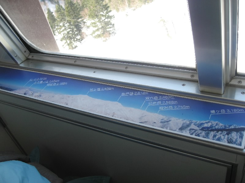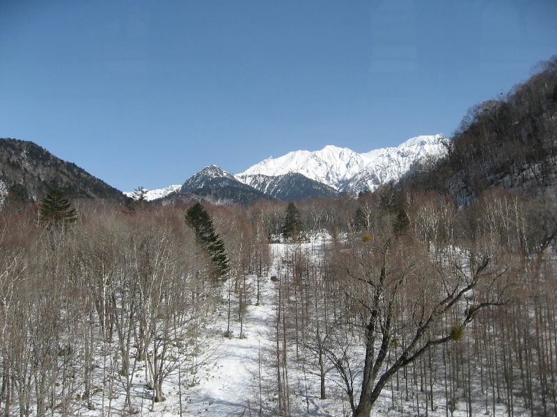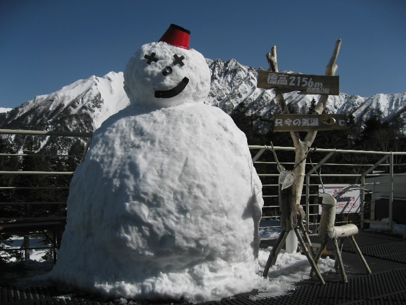 終点の西穂高駅口に到着。駅の建物を上がると、そこは展望台になっている。外に出ると風があってかなり寒いが、雲が一つも無い青空の中で一面に見える北アルプス、これぞ絶景だ。マイナス4度の中、いろんな角度でたくさんの写真をとって楽しむ。遠くに石川県の白山が見えたり、とがった槍ヶ岳がきれいに見えたり。なかなかここまできれいには見えないらしい。昨日は晴れていたのに風が強くて運休だったらしいし。ラッキーだね。今日も十分寒いが先週はマイナス14度だったらしい。まあ今日はこれでもかなり暖かいようだし、これもラッキーだね。