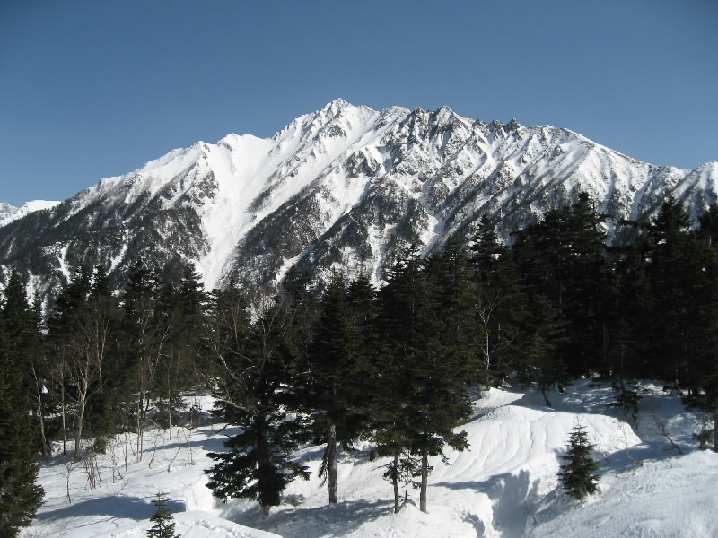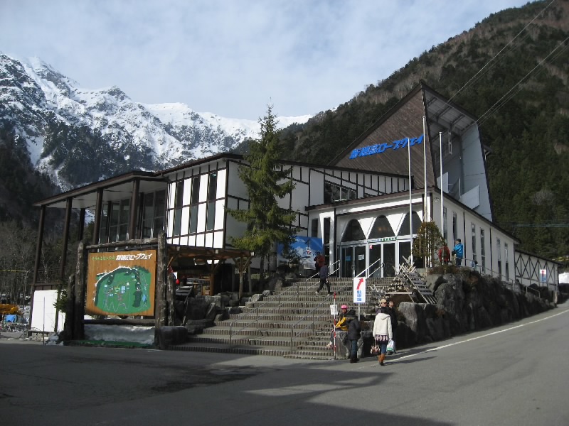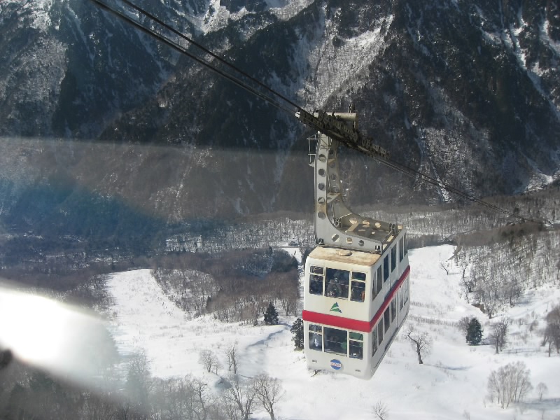 目が覚めた。外を見ると、どんよりした感じ。天気予報では晴れだったので今日は穂高に行こうと思っていたが、このどんより空ではロープウェイにのっても景色は見えないかな。晴れていれば穂高行き始発の7:40に乗ろうと思っていたが、これじゃね・・・とりあえずパンとドリンクの簡単な朝ごはんをいただき、部屋に戻る。うーん、今日はどうしようか、奥飛騨に行ってもホテルには夕方までは入れないし、高山でうろうろするのもあまり気が乗らないし、どうしようかなあ。念のため、穂高のロープウェーに電話をしてみる。「今そちらのお天気はどうですか」「快晴です」・・・えっ?高山はこんなにどんよりしているのに、山のほうは快晴?それならばとりあえず出よう。急いで準備をして、なんとか8:40のバスに間に合った。高山市街を抜け、しばらくすると晴れ間がのぞいてきた。そうなんだ。いつの間にやら雲ひとつ無い快晴の中、山あいを抜け、スキー場や温泉街を走る。遠くに雪をいだく山並みが見え、いい景色だ。奥飛騨に入り、途中の温泉宿からバスに乗ってくる人が増えてきて、終点の新穂高温泉につく頃にはもう満席。そして、天気は本当に快晴だ。
