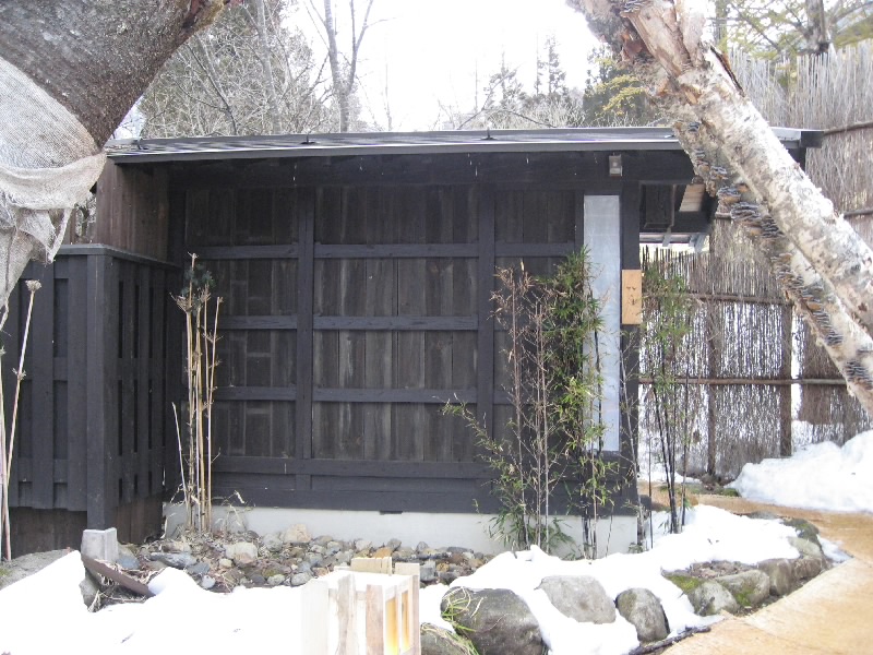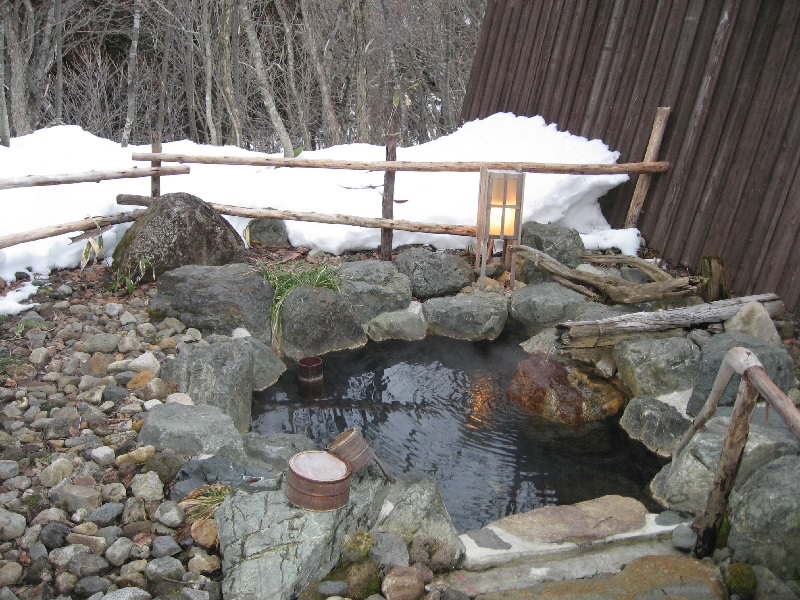 そうと決まればさっそくお風呂に行きましょうか。まずは貸切の露天風呂へ。館内から外へと繋がる藁葺きの通路をぬけると、そこには小さな小屋があり、中には露天風呂が。雪が積もった中、熱めの露天風呂に入るのは気持ちがいいね。ゆったりした時間の中、しっかり温まりました。